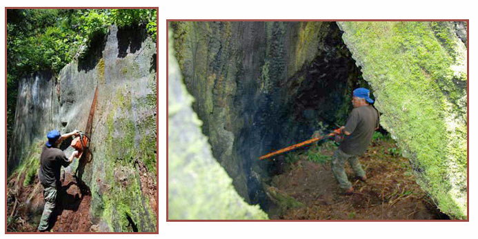 Stumps left over from logging long ago can yield very fine burlwood and could be salvaged with permission. Shown below, accessing an ancient old-growth Redwood stump, logged off around the turn of the century, for salvage cuts of beautiful figured wood.