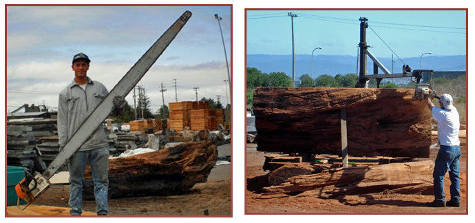 How did we handle enormous pieces of wood like this? How about a HUGE chainsaw (below) and a mobile chainsaw mill for slabbing out the Redwood. Then the wood slabs and burls can be stacked for drying and sales.