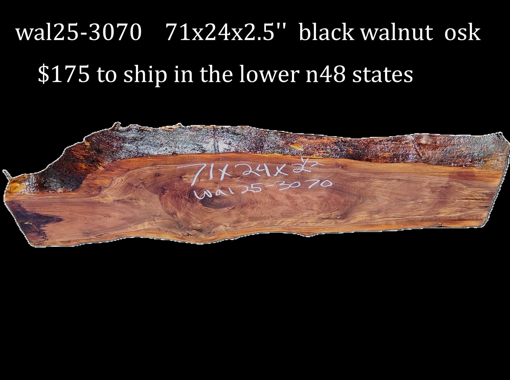 Wal25-3070 Black Walnut slab, cut in Eureka, size as pictured 71x24x2.5''. Let this slab acclimate to your area for about 2+ months. Work it, use it, but do not finish until dry. This sale is for one unfinished piece, rough-sanded and cleaned up, but not finished.