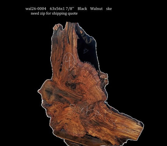 Wal26-0004 Black Walnut slab, cut in Eureka, size as pictured 63x56x1 7/8''. Let this slab acclimate to your area for about 2+ months. Work it, use it, but do not finish until dry. This sale is for one unfinished piece, rough sanded and cleaned up, but not finished.