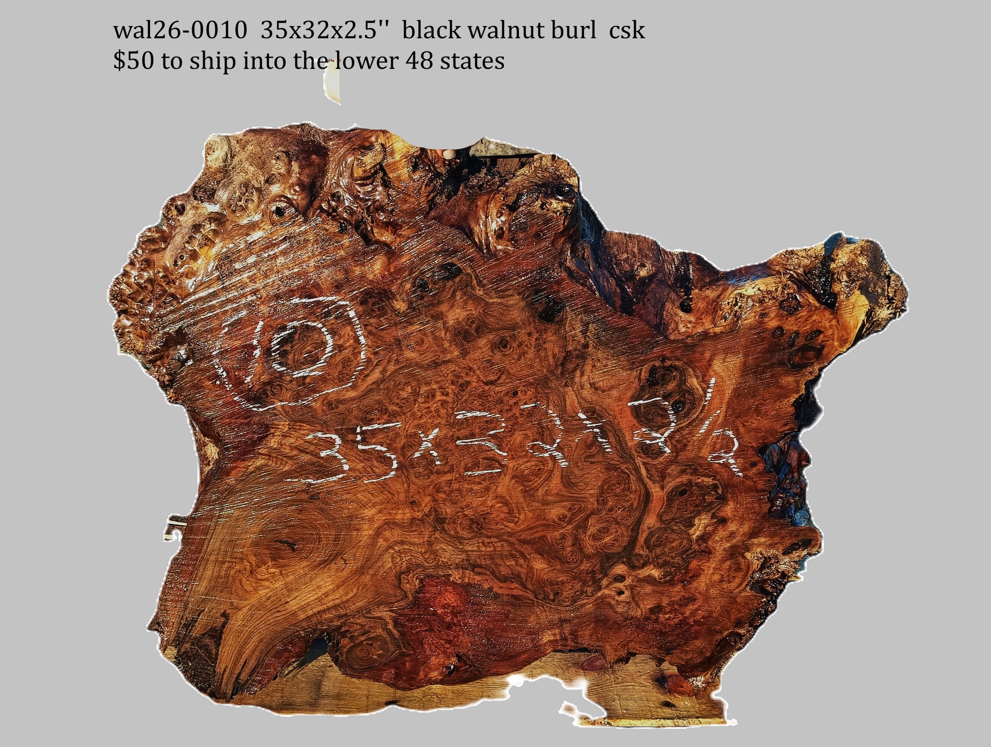Wal26-0010 Black Walnut slab, cut in Eureka, size as pictured 35x32x2.5''. Let this slab acclimate to your area for about 2+ months. Work it, use it, but do not finish until dry. This sale is for one unfinished piece, rough sanded and cleaned up, but not finished.