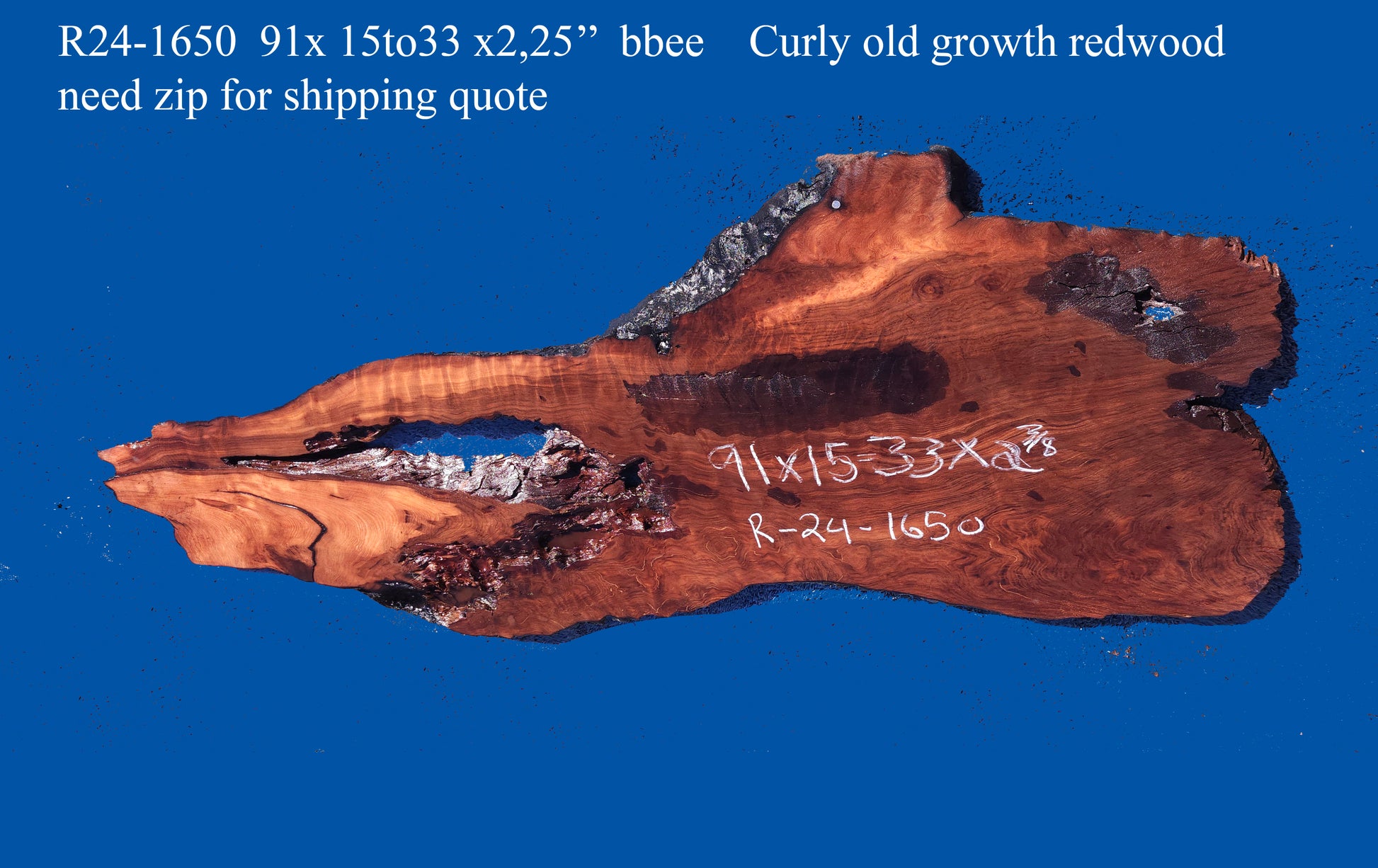 Curly redwood slab R24-1650. Cut to 91x33x2.5" Let this slab acclimate to your area for about 2 months. Work it, use it, but do not finish until dry. This sale is for 1 unfinished slab, cleaned up and rough sanded. This would make a good table, wall art, etc. This slab is dry.