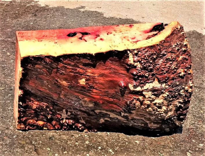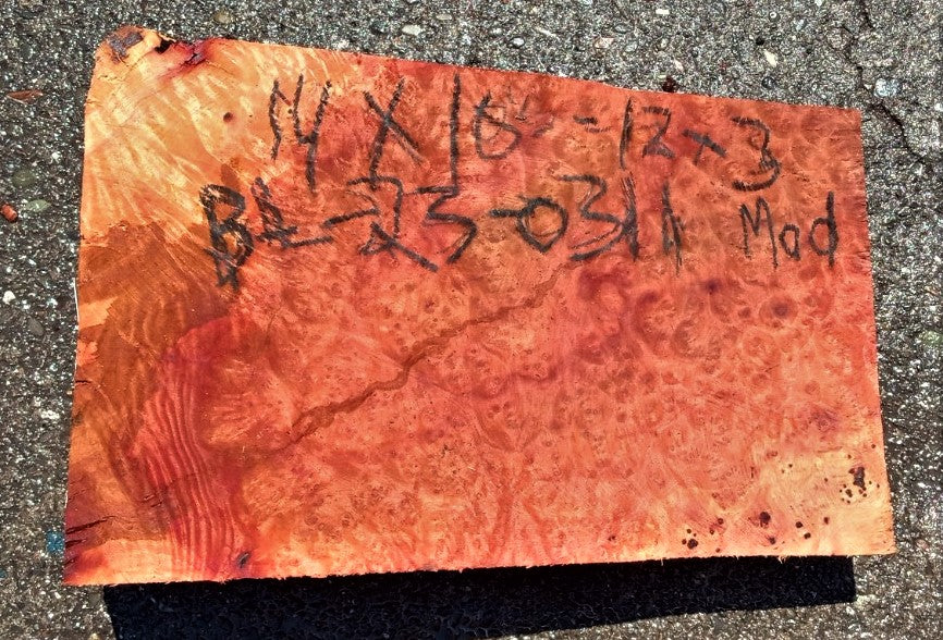 bl23-0311 Madrone burl block, cut in Eureka, 14x 10to12 x3'' thick. Dead for several years. This has one natural burl edge. Let this slab acclimate to your area for about 2to3 months. Work it, use it but no finish until dry. This sale is for 1 unfinished piece, rough sanded and cleaned up but not finished. As in all wild woods watch out for bugs. Ask about this wood if you do not know it.