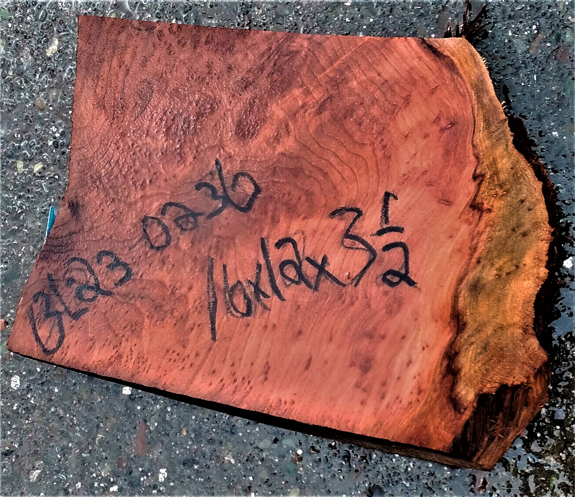 bl23-0236 Old growth Redwood burl block cut in Eureka, 16x12x3.5" thick. Dead for several years. Let this slab acclimate to your area for about 2to3 months. Work it, use it but no finish until dry. This sale is for 1 unfinished piece, rough sanded and cleaned up but not finished.