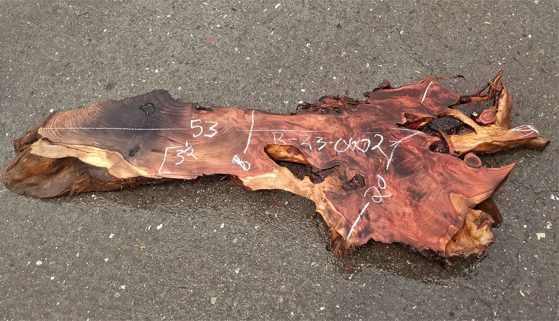 r23-0602 Curly Redwood burl slab cut in Eureka, to 53x20x3.5'' Dead for 100 years and may have been a live tree at the time of Christ. Let this slab acclimate to your area for about 2+ months. Work it, use it but no finish until dry. This sale is for 1 unfinished piece, rough sanded and cleaned up but not finished.