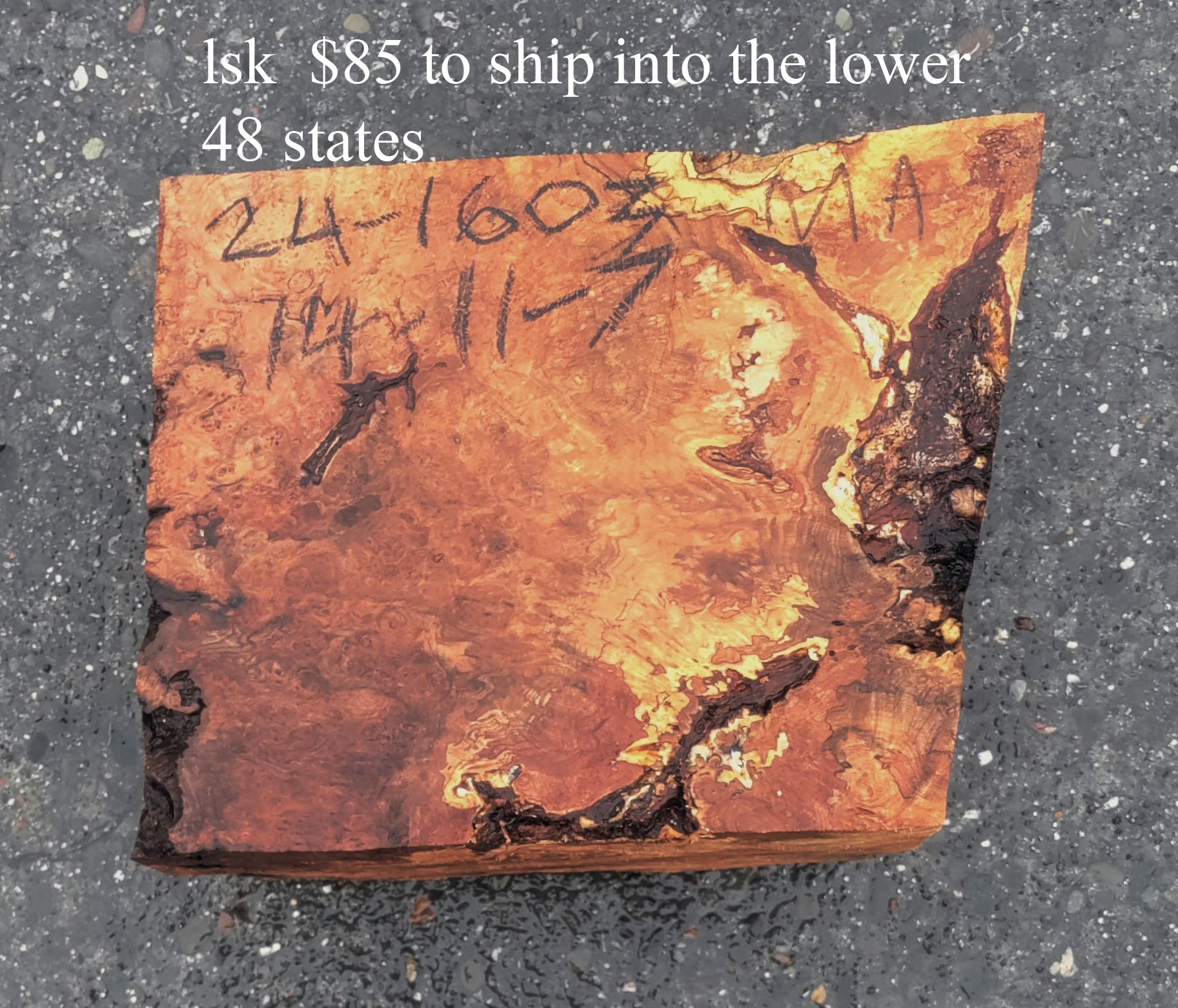 Shipping is $705 to the lower 48 states only. Shipping to anywhere outside of the lower 48 states will incur fees. I have over 1000 quilted, curly, burl, and figured grain pieces; mostly Redwood, Myrtle, Walnut, Maple, and Poplar. As I am on the coast most pieces are not completely dry. Of course, the best pieces always sell first wet or dry.