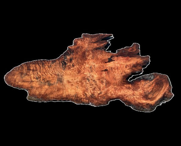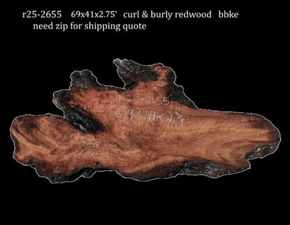 R25-2655 Curl and Burly Redwood size 69x41x2.75" cut in Eureka. Dead for 20 years. Let this slab acclimate to your area for about 2 to 3 months. Work it, use it, but do not finish until dry. This sale is for one unfinished piece, rough sanded and cleaned up, but not finished.