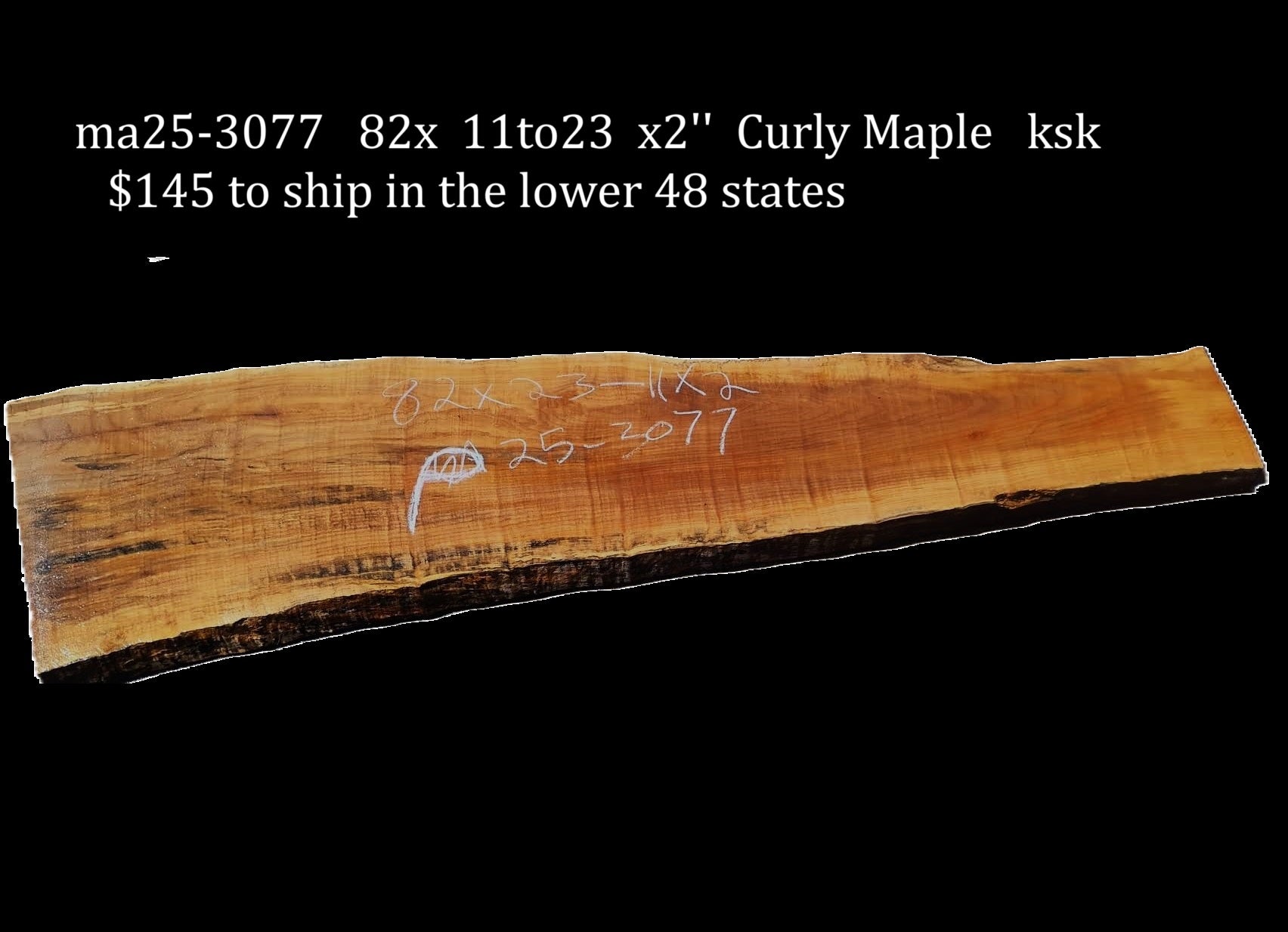 ma25-3077 Curly Maple Burl Slab 82x11 to23 x2.5". Allow this slab to acclimate to your area for approximately 2 to 3 months. Work it, use it, but don't finish until dry. This sale is for one piece, rough-sanded and cleaned up, but not finished.