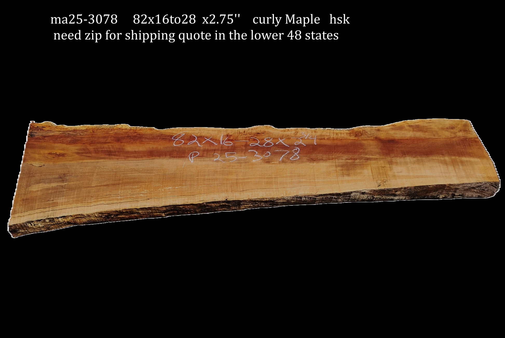 ma25-3078 Curly Maple Burl Slab 82x16 to28 x2.75". Allow this slab to acclimate to your area for approximately 2 to 3 months. Work it, use it, but don't finish until dry. This sale is for one piece, rough-sanded and cleaned up, but not finished.