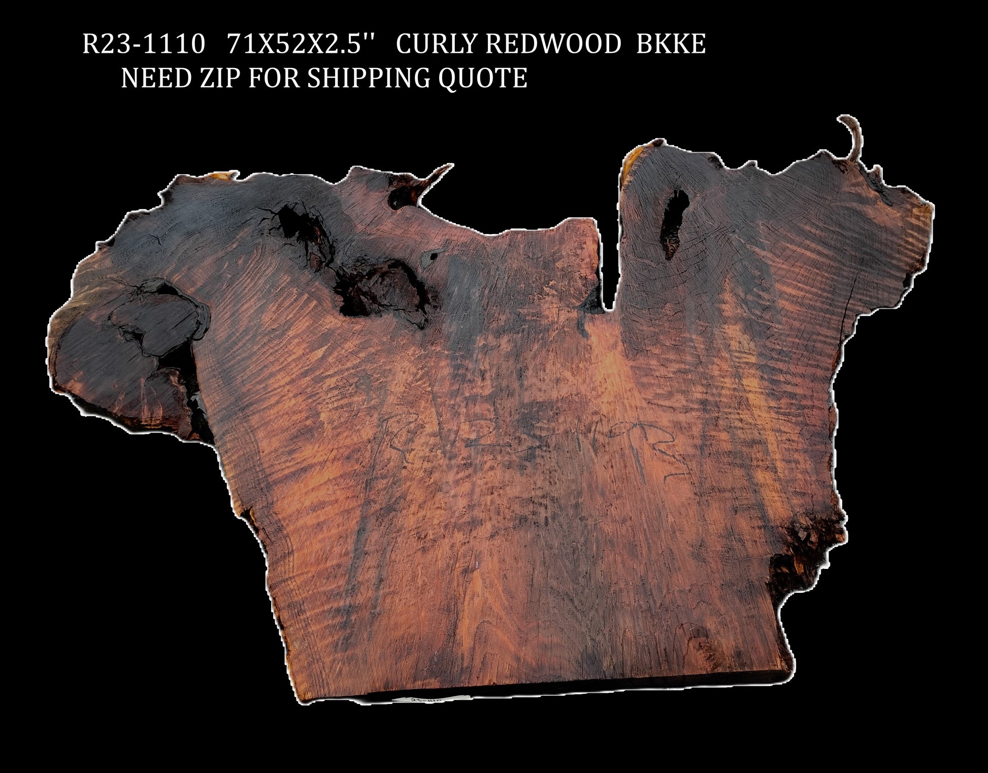 R23-1110 Curly Redwood Burl for River Table, Craft Wood, or DIY projects. Cut: 71x52x2.5". Dead for 20 years. Allow this slab to acclimate to your area for 2 to 3 months. Work it, use it, but don't finish until dry. This sale is for one unfinished piece, rough-sanded and cleaned, but not finished.