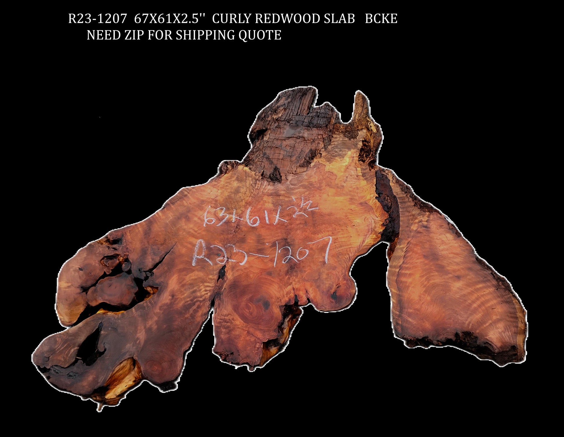 R23-1207 Curly Redwood Burl for River Table, Craft Wood, or DIY projects. Cut: 67x61x2.5". Dead for 15 years. Allow this slab to acclimate to your area for 2 to 3 months. Work it, use it, but don't finish until dry. This sale is for one unfinished piece, rough-sanded and cleaned, but not finished.