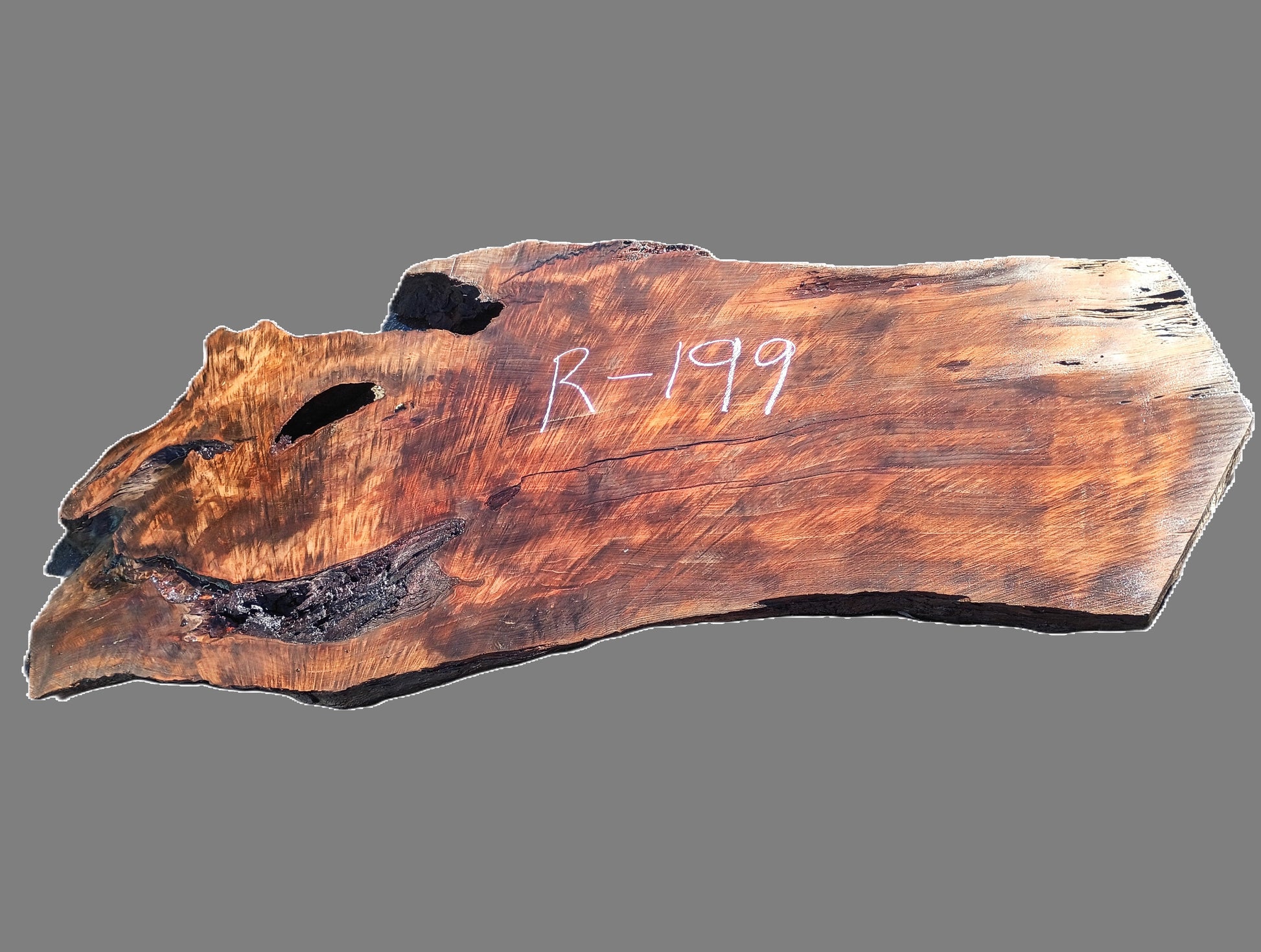 R-199 Curly Redwood Burl, cut: 100x43x3'' Let this slab acclimate to your area for 1-3 months. Work it, use it, but don't finish until dry.