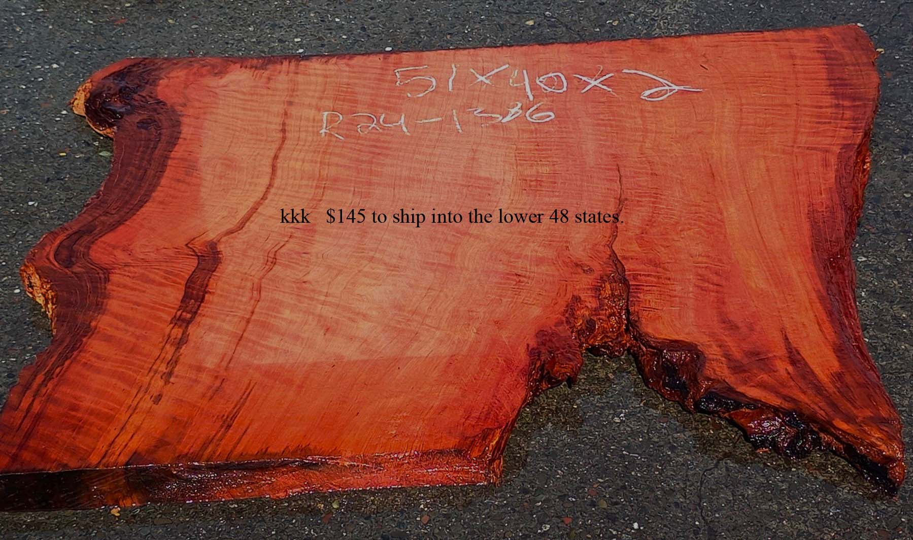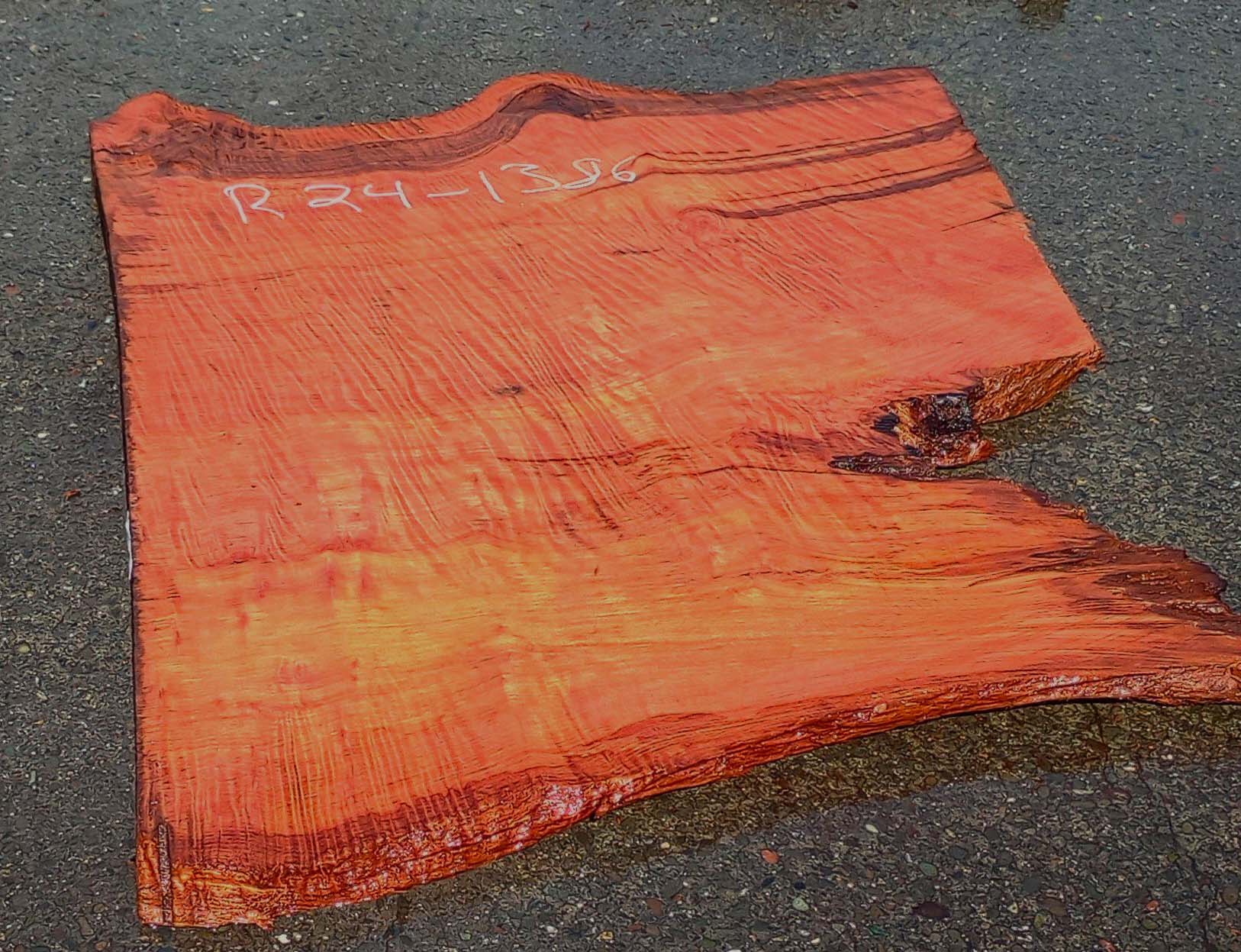 Curly redwood slab R24-1386. Cut to 51x40x2" Let this slab acclimate to your area for about 3 months. Work it, use it, but do not finish until dry. This sale is for 1 unfinished slab, cleaned up and rough sanded.