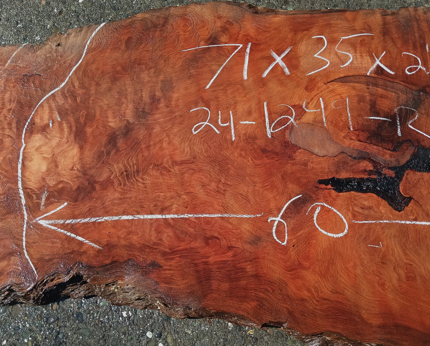 Curly redwood slab R24-1241. Cut to 71x35x2.5''. Let this slab acclimate to your area for about 3 to 5 months. Work it, use it, but do not finish until dry. I have 10 other slabs from this burl. This sale is for 1 unfinished slab, cleaned up and rough sanded. This slab may have been part of a live three at the time of Christ.