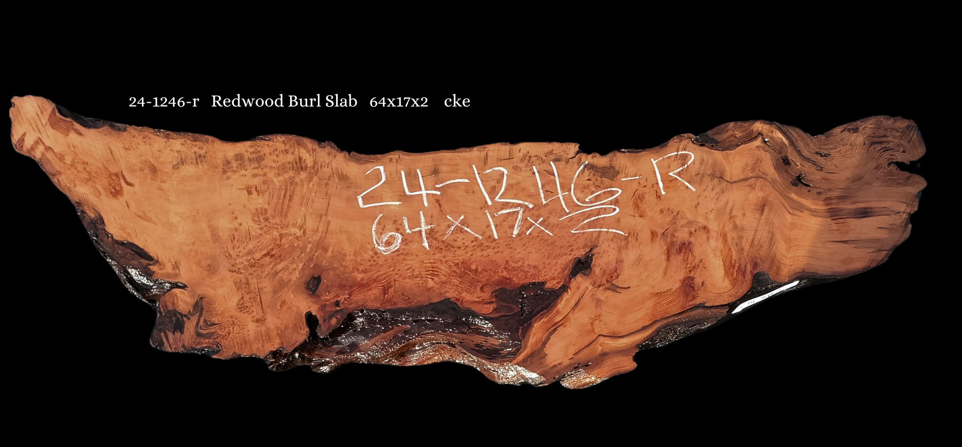 Live edge redwood slab 24-1246-r. Cut to 64x17x2". Let this slab acclimate to your area for about 2+ months. Work it, use it, but do not finish until dry. This sale is for 1 unfinished slab, cleaned up and rough sanded.
