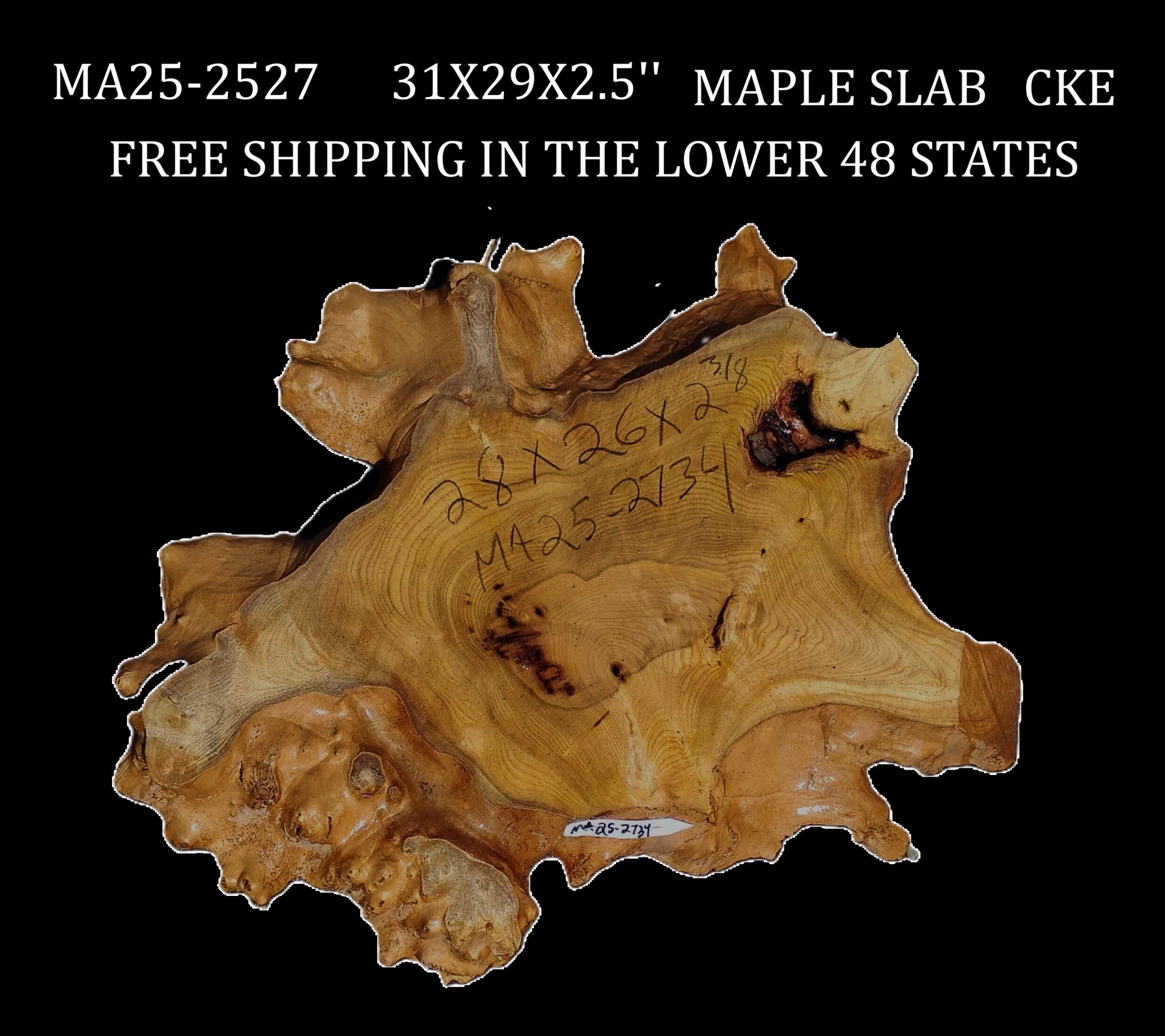 MA25-2734 Maple Burl 31x29x2.5", cut in Eureka. Dead for 10 years. Let this slab acclimate to your area for about 2 to 4 months. Work it and use it, but do not finish until dry. This sale is for one unfinished piece, rough sanded and cleaned up, but not finished.