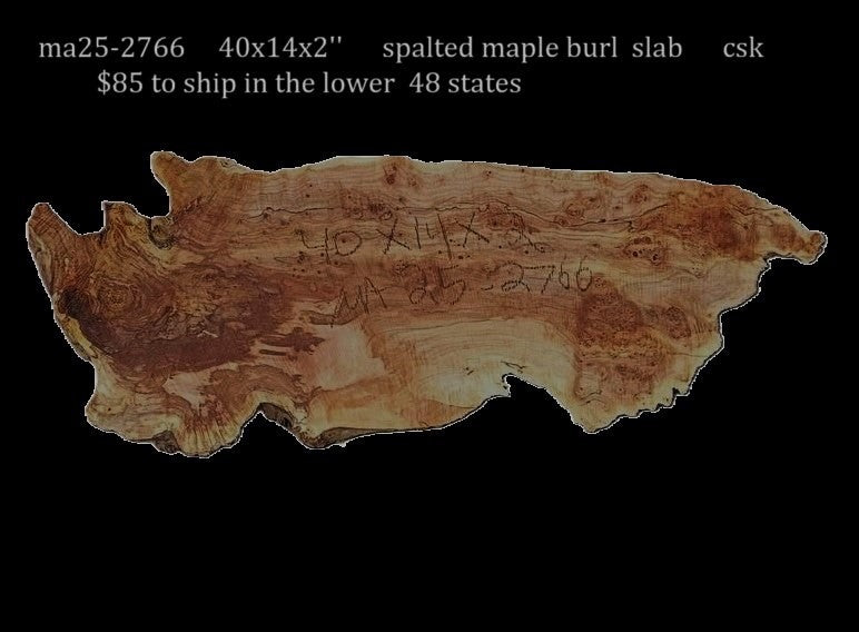 MA25-2931 Spalted Maple Slab 40 x 14 x 2" cut in Eureka. Allow this slab to acclimate to your area for approximately 2 to 4 months. Work it and use it, but do not finish until dry. This sale is for one unfinished piece, rough sanded and cleaned up.
