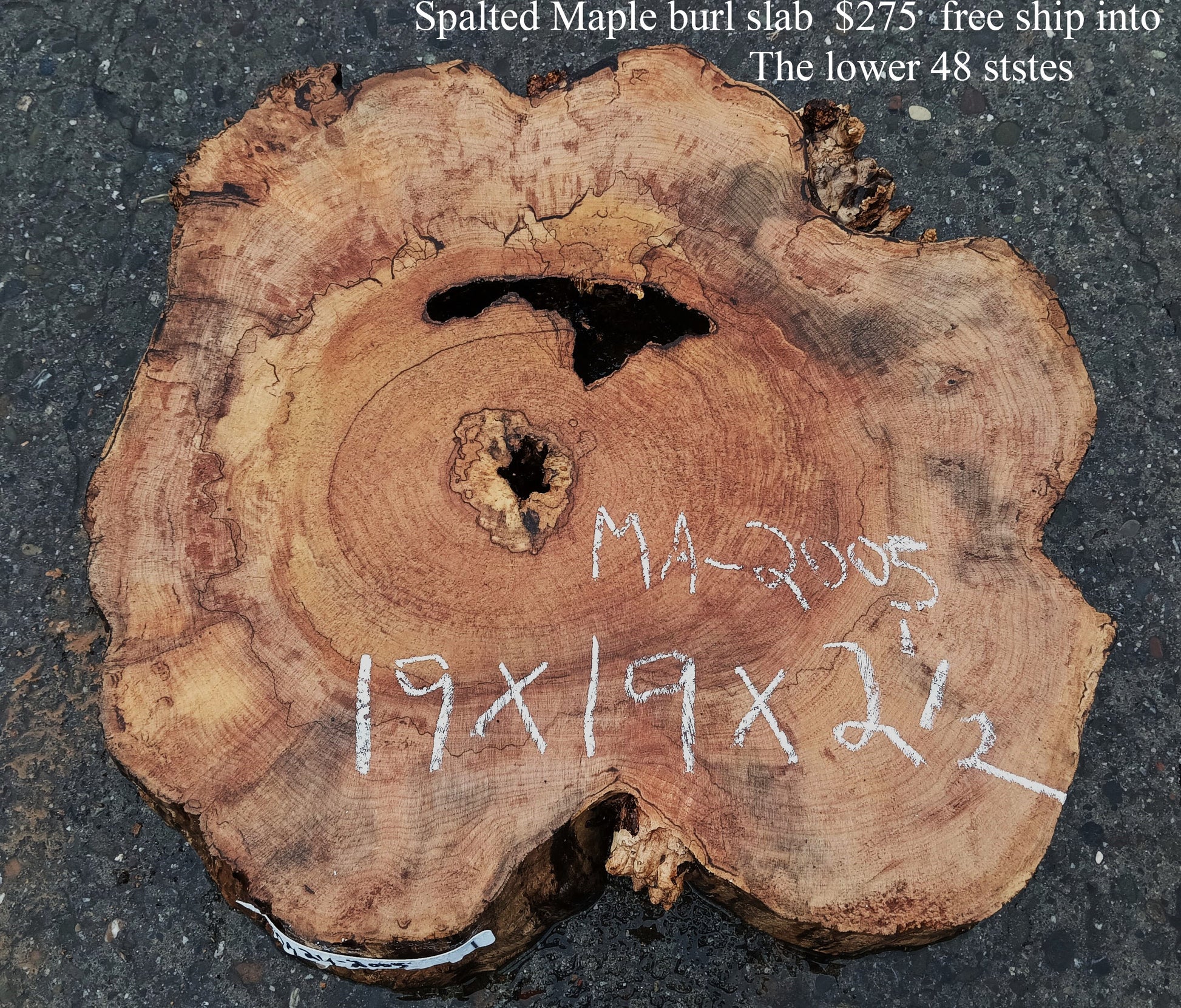 Ma24-2005 Maple Burl slab cut in Eureka, 19x19x2.5" thick. Dead for several years. Let this slab acclimate to your area for about 2to3 months. Work it, use it but do not finish until dry. This sale is for 1 piece, rough sanded and cleaned up but not finished.