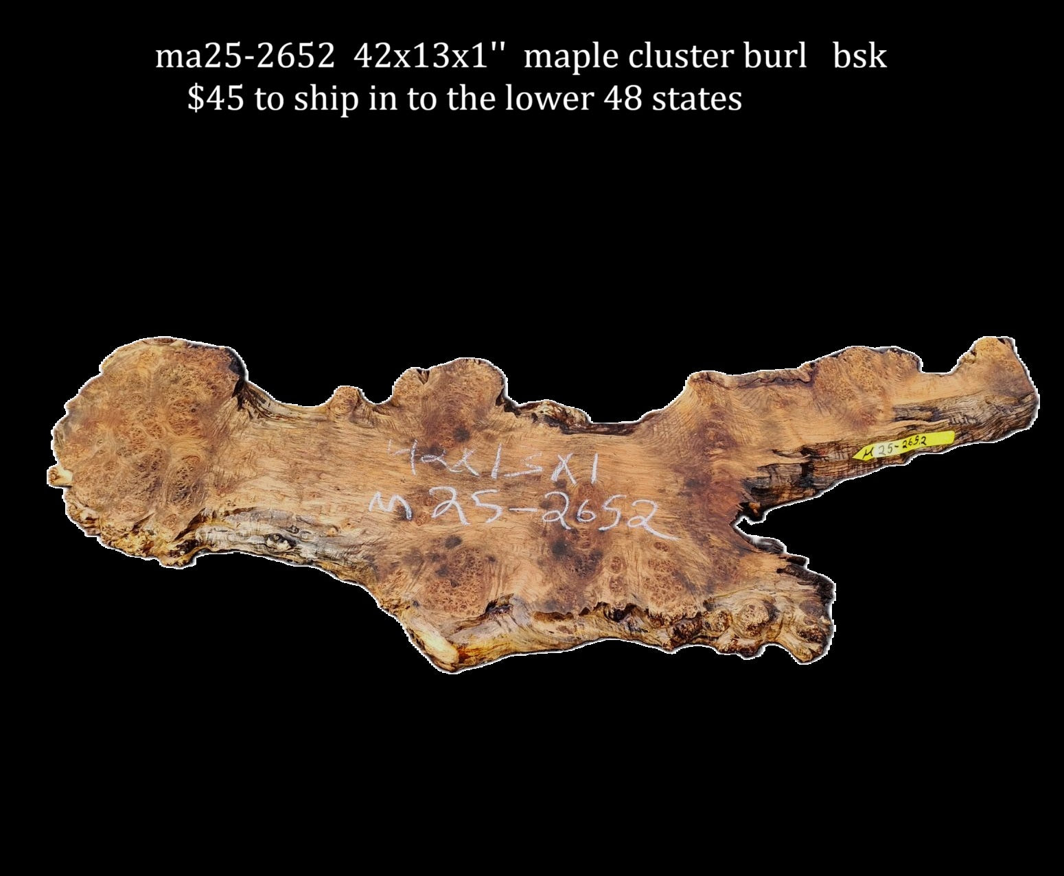 Ma25-2652 Maple Cluster Burl / Charcuterie Table 42x13x1" slab, cut in Eureka. Dead for 20 years. Let these slabs acclimate to your area for about 2 months. Work it, use it, but do not finish until dry. This sale is for 1 unfinished piece, rough sanded and cleaned up but not finished.