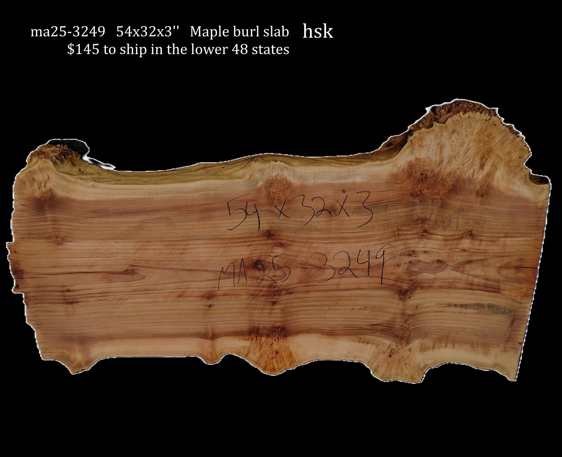 MA25-2349 Maple Slab. Cut to: 54x32x3" Let this slab acclimate to your area for about 2 to 3 months. Work it, use it but do not finish until dry. This sale is for 1 unfinished piece, rough sanded and cleaned up but not finished.