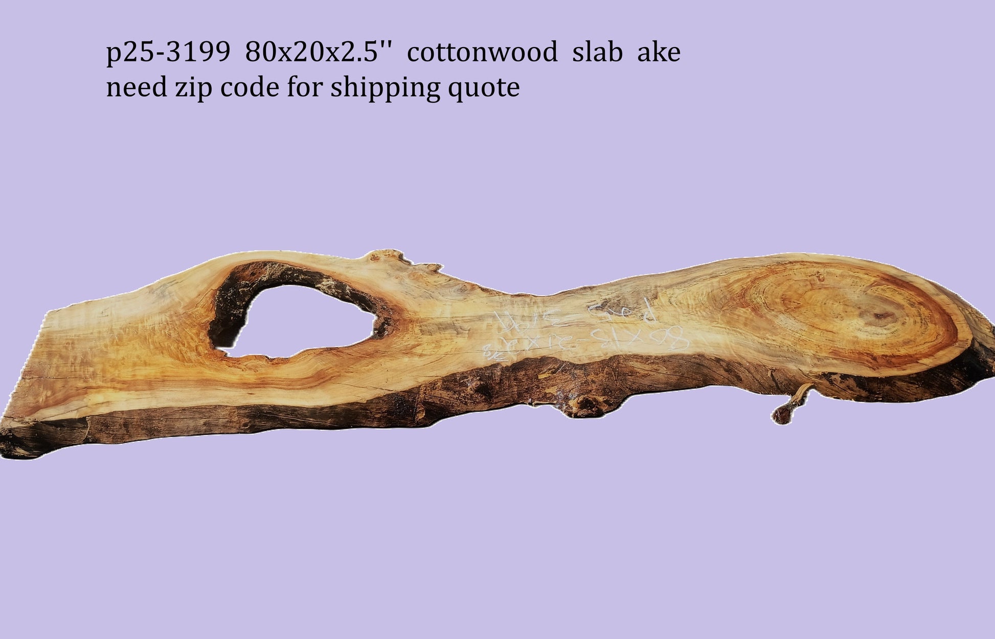 P25-3199 Cottonwood 80x20x2.5". Allow this slab to acclimate to your area for approximately 2 to 3 months. Work it, use it, but don't finish until dry. This sale is for one piece, rough-sanded and cleaned up, but not finished.