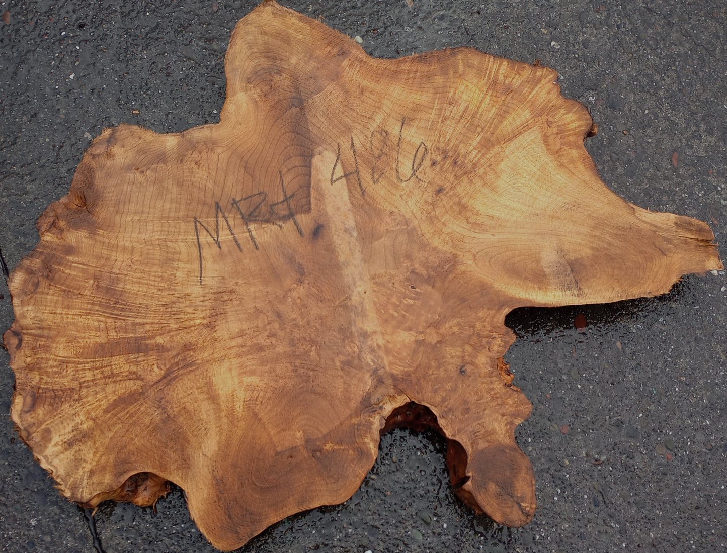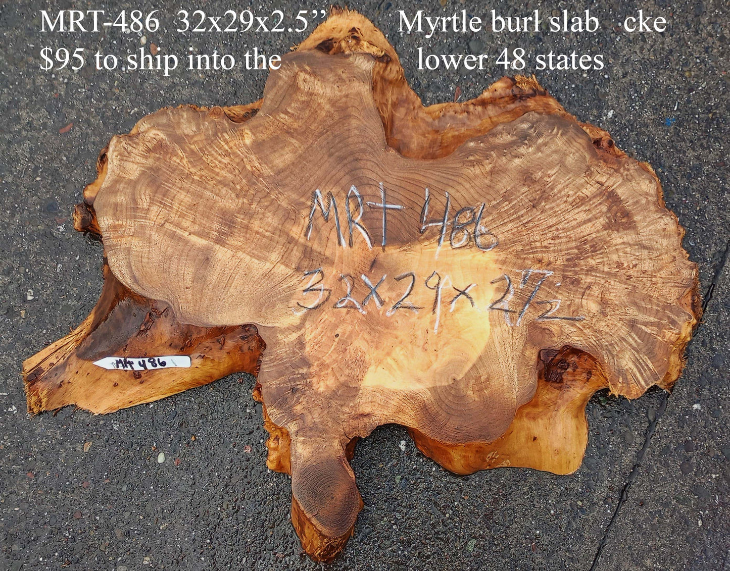 MRT24-486 Myrtle burl slab cut in Eureka, 32x29x2.5" thick. Dead for several years. Let this slab acclimate to your area for about 2to3 months. Work it, use it but do not finish until dry. This sale is for 1 piece, rough sanded and cleaned up but not finished.