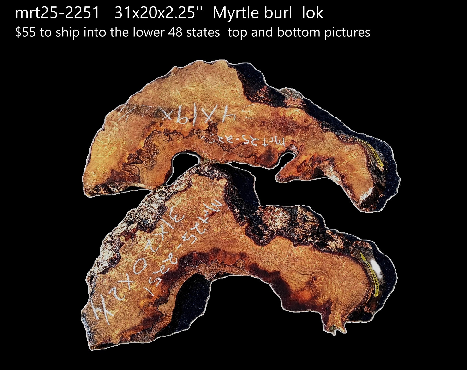 Mrt25-2251 Myrtle Burl slab cut in Eureka, 31x20x2.25". Dead for several years. Let this slab acclimate to your area for about 2 to 3 months. Work it, use it but do not finish until dry. This sale is for 1 piece, rough sanded and cleaned up but not finished.