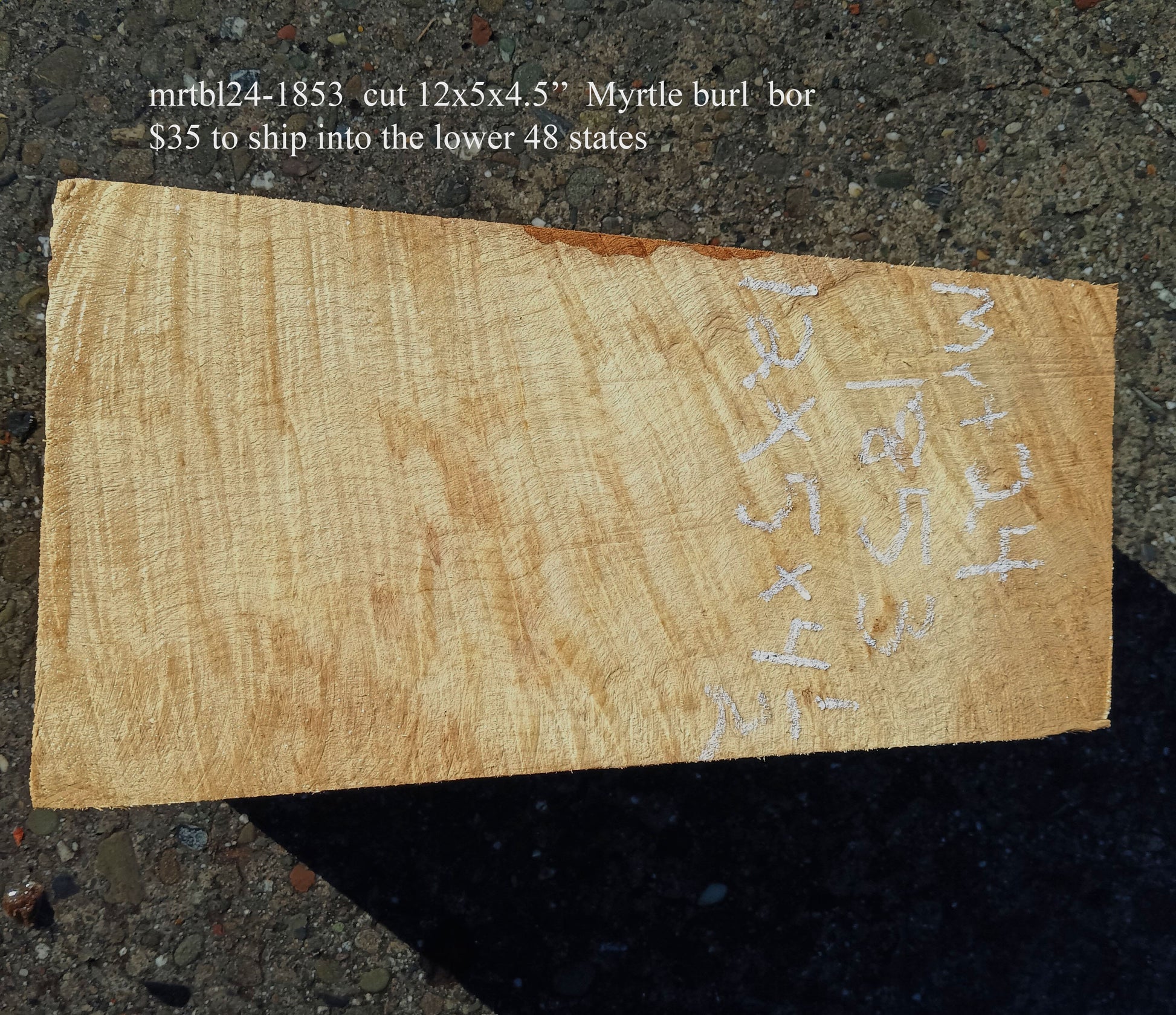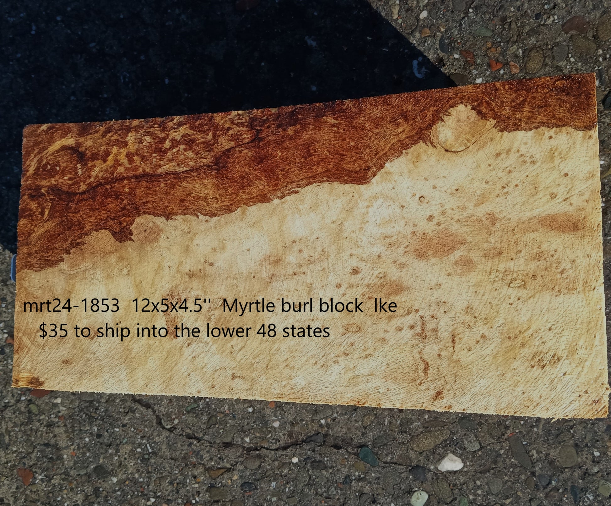 Mrtbl24-1853 Spalted Myrtle Wood Burl slab cut in Eureka, 12x5x4.5" thick. Dead for several years. Let this slab acclimate to your area for about 2 to 3 months. Work it, use it but do not finish until dry. This sale is for 1 piece, rough sanded and cleaned up but not finished.