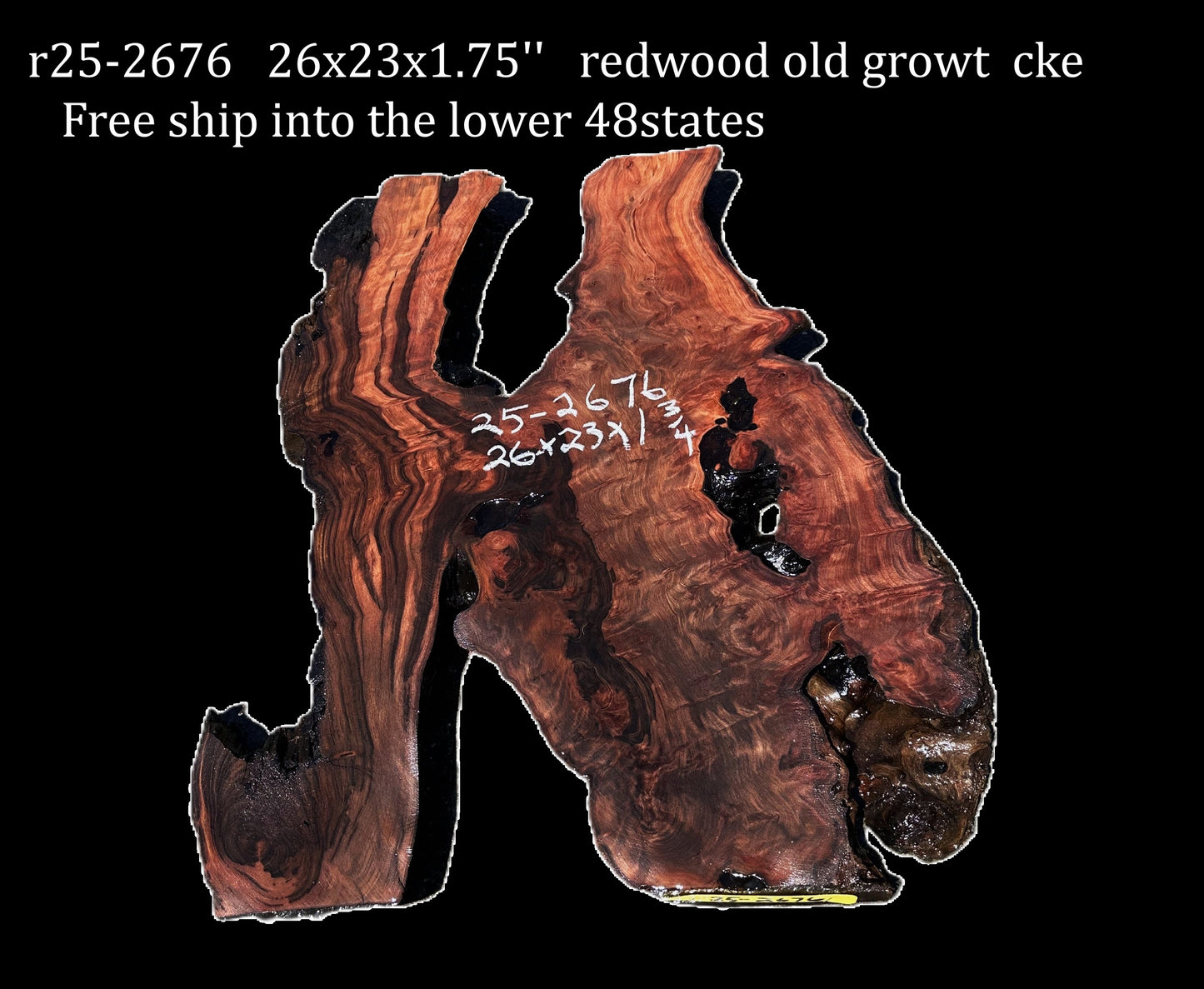R25-2676 Redwood Slab for River Table or Craft Wood size 26x23x1.75" cut in Eureka. Dead for 20 years. Let this slab acclimate to your area for about 2 to 3 months. Work it, use it, but do not finish until dry. This sale is for one unfinished piece, rough sanded and cleaned up, but not finished.