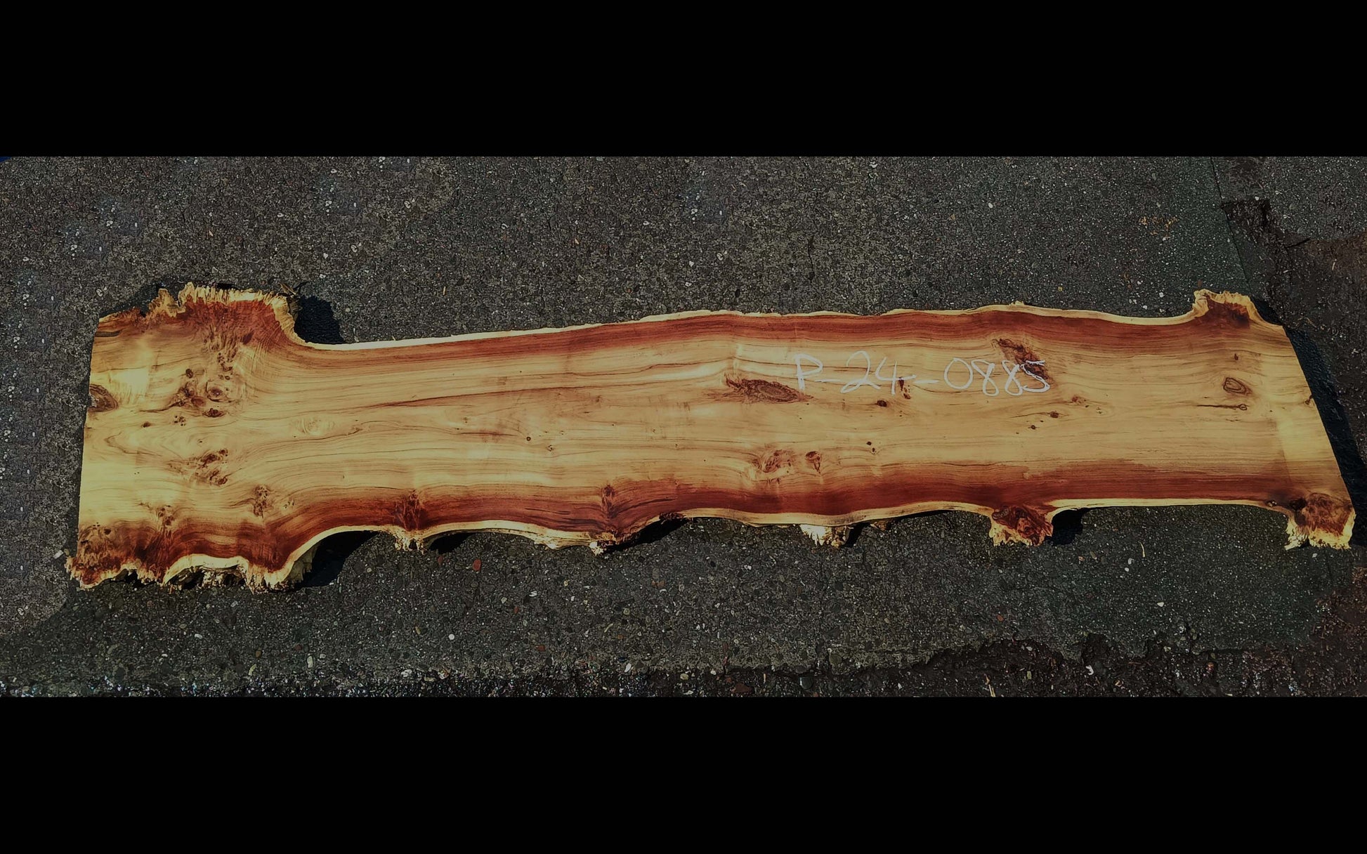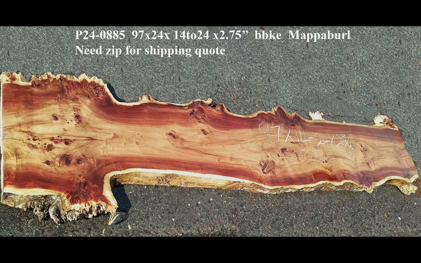 Poplar Burl slab P24-0885. Cut to 97x14-24x2.75''. Let this slab acclimate to your area for about 3 to 5 months. This sale is for 1 unfinished slab, cleaned up and rough sanded.