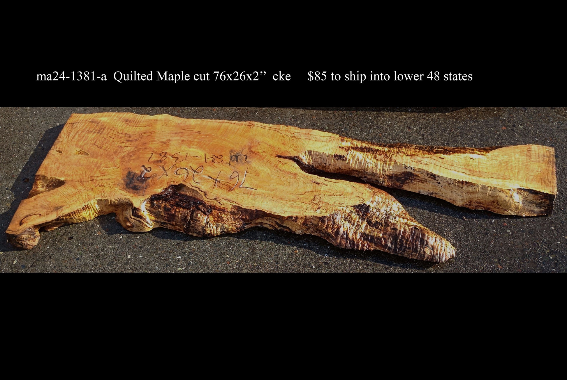 MA24-1381 Maple slab cut in Eureka, 76x26x2" thick. Dead for several years. Let this slab acclimate to your area for about 2to3 months. Work it, use it but do not finish until dry. This sale is for 1 piece, rough sanded and cleaned up but not finished.