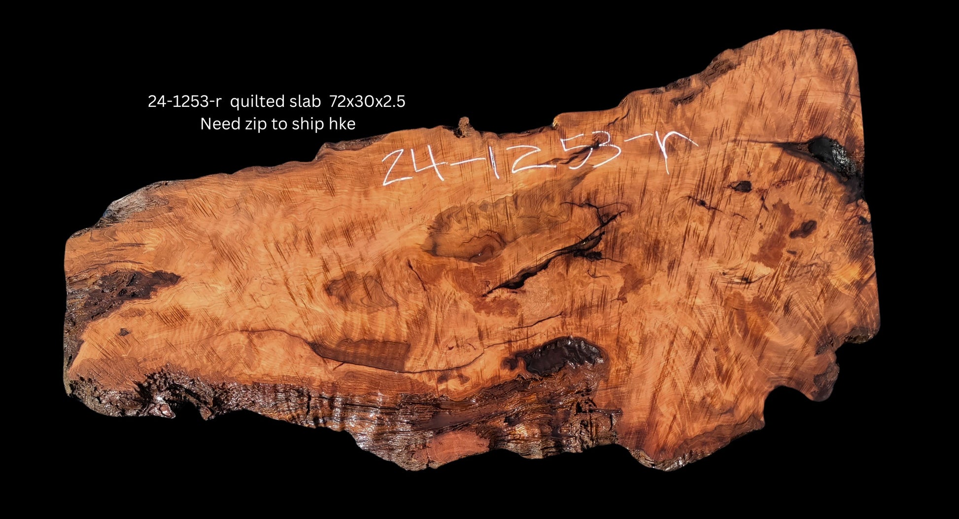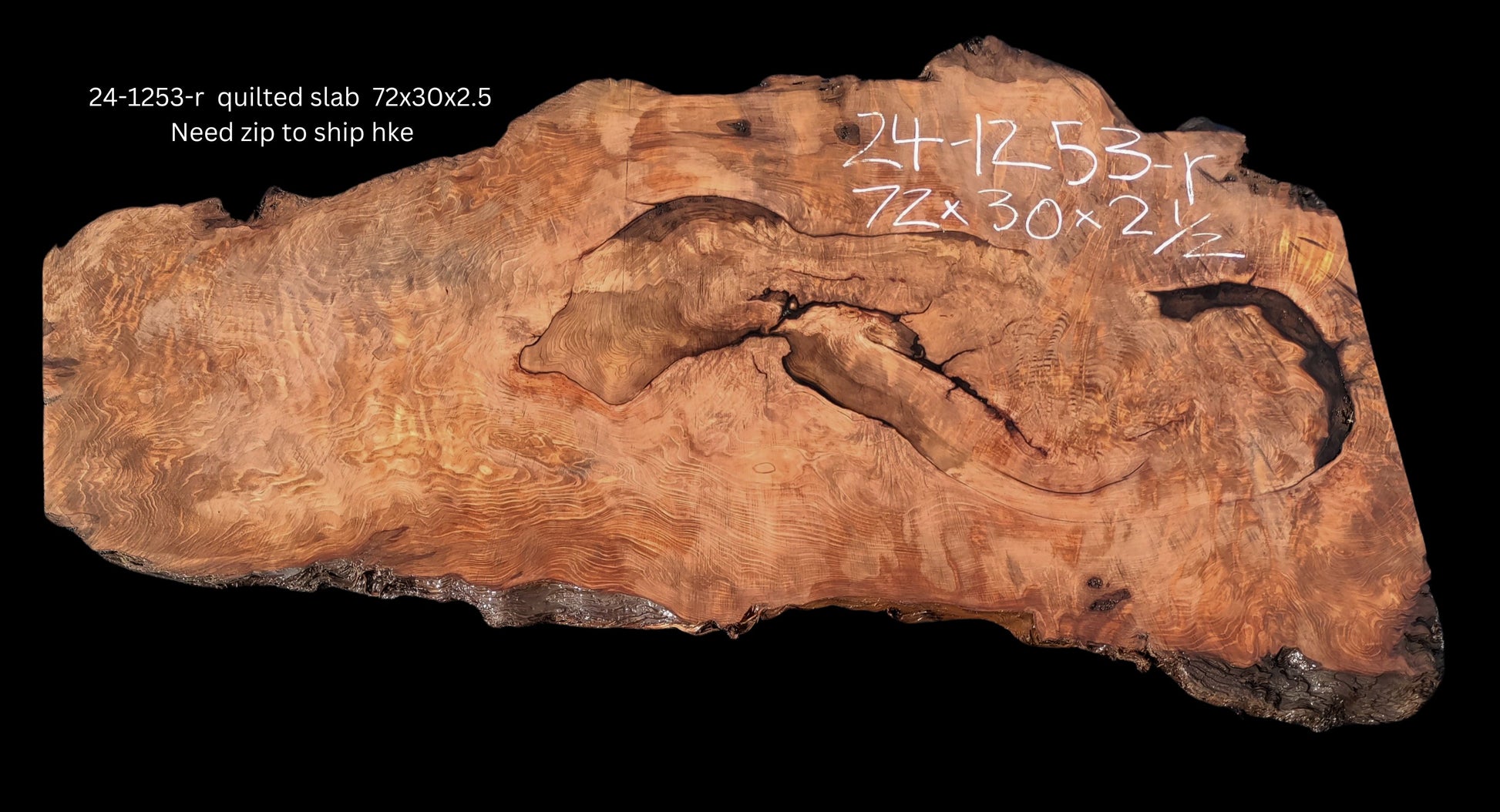 Live edge quilted redwood slab 24-1253-r. Cut to 72x30x2.5" Let this slab acclimate to your area for about 2+ months. Work it, use it, but do not finish until dry. This sale is for 1 unfinished slab, cleaned up and rough sanded. Could be a beautiful counter, bar, desk, etc
