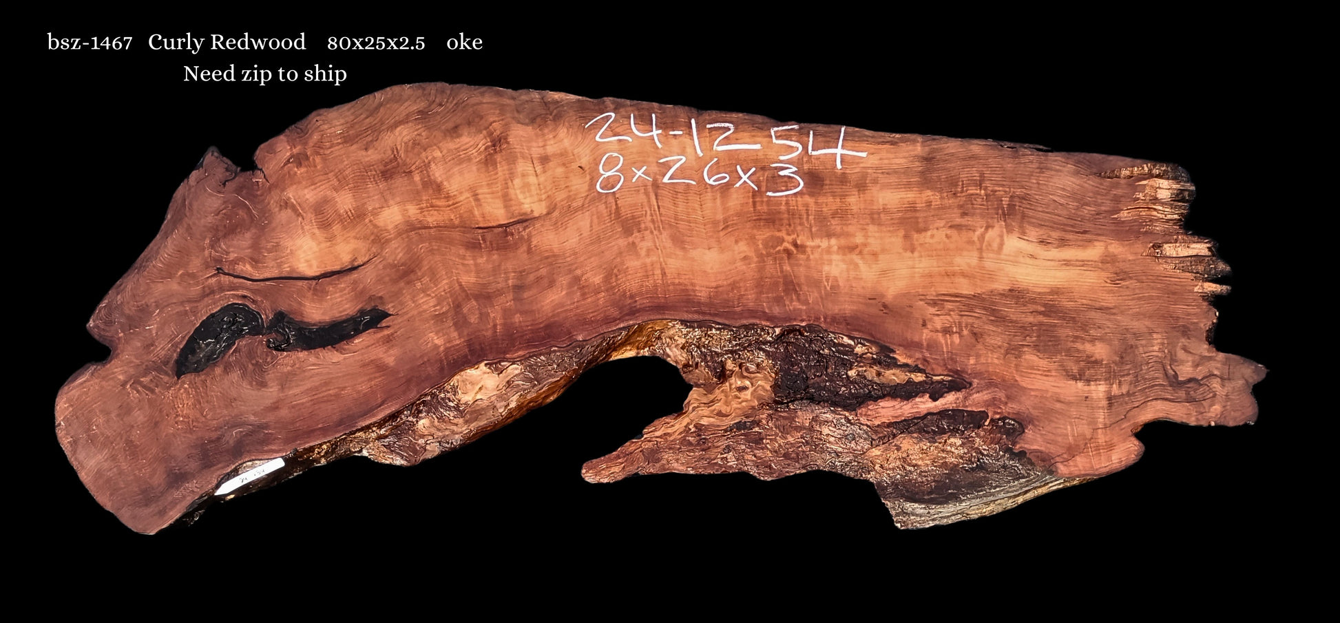Live edge curly redwood slab bsz-1467. Cut to 80x25x2.5" Let this slab acclimate to your area for about 2+ months. Work it, use it, but do not finish until dry. This sale is for 1 unfinished slab, cleaned up and rough sanded. Could be a beautiful counter, headboard. bar, desk, etc