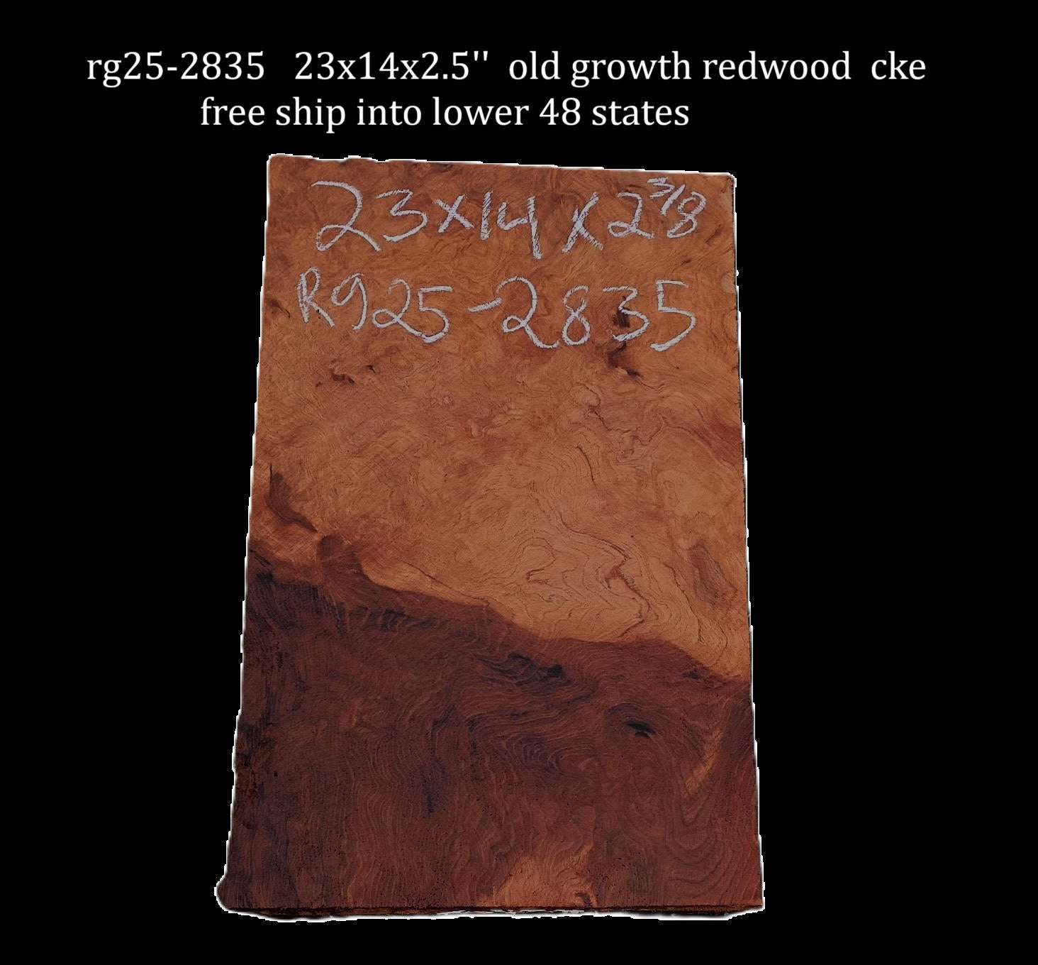 RG25-2835 Quilted Redwood Slab for River Table, Craft Wood or guitar billets 23x14x2.5" cut in Eureka. Allow this slab to acclimate to your area for approximately 2 months. Work it and use it, but do not finish until dry. This sale is for one unfinished piece, rough-sanded and cleaned up, but not finished.