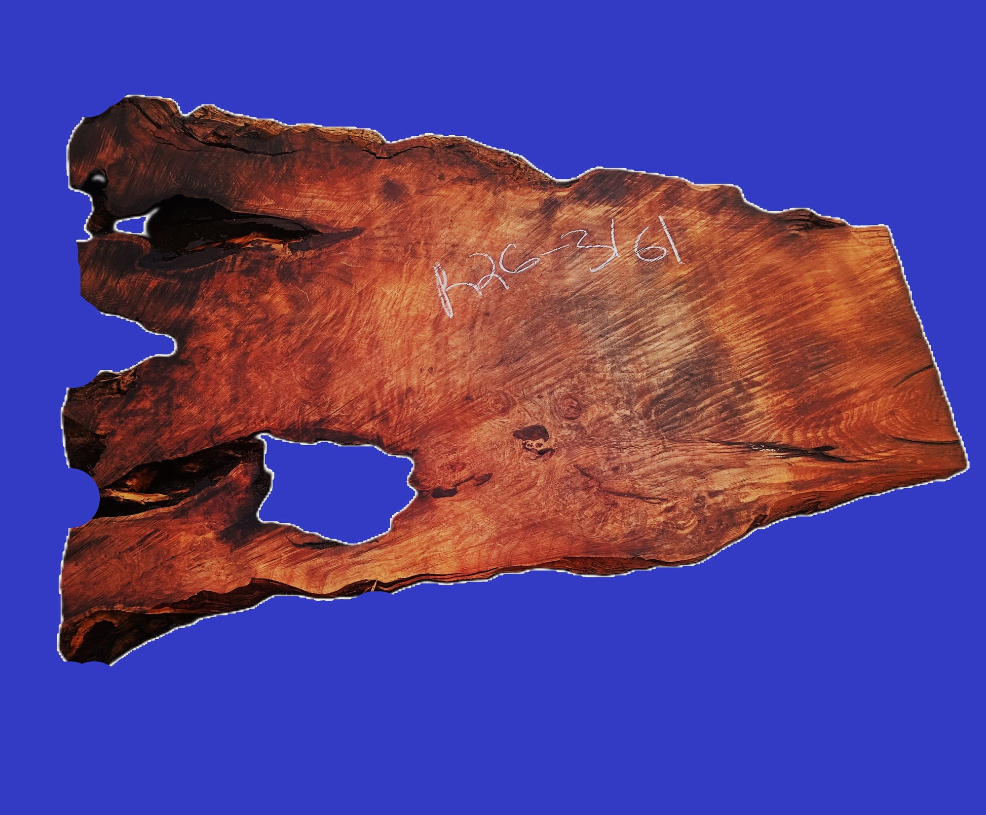 R26-3161 Redwood Burl Slab, size 56 x 21 to 40 x 2.5", cut in Eureka. Allow the slab acclimate to your area for 2 to 4 months. Work it, use it, but don't finish until dry. This sale is for 1 unfinished piece, rough-sanded and cleaned.