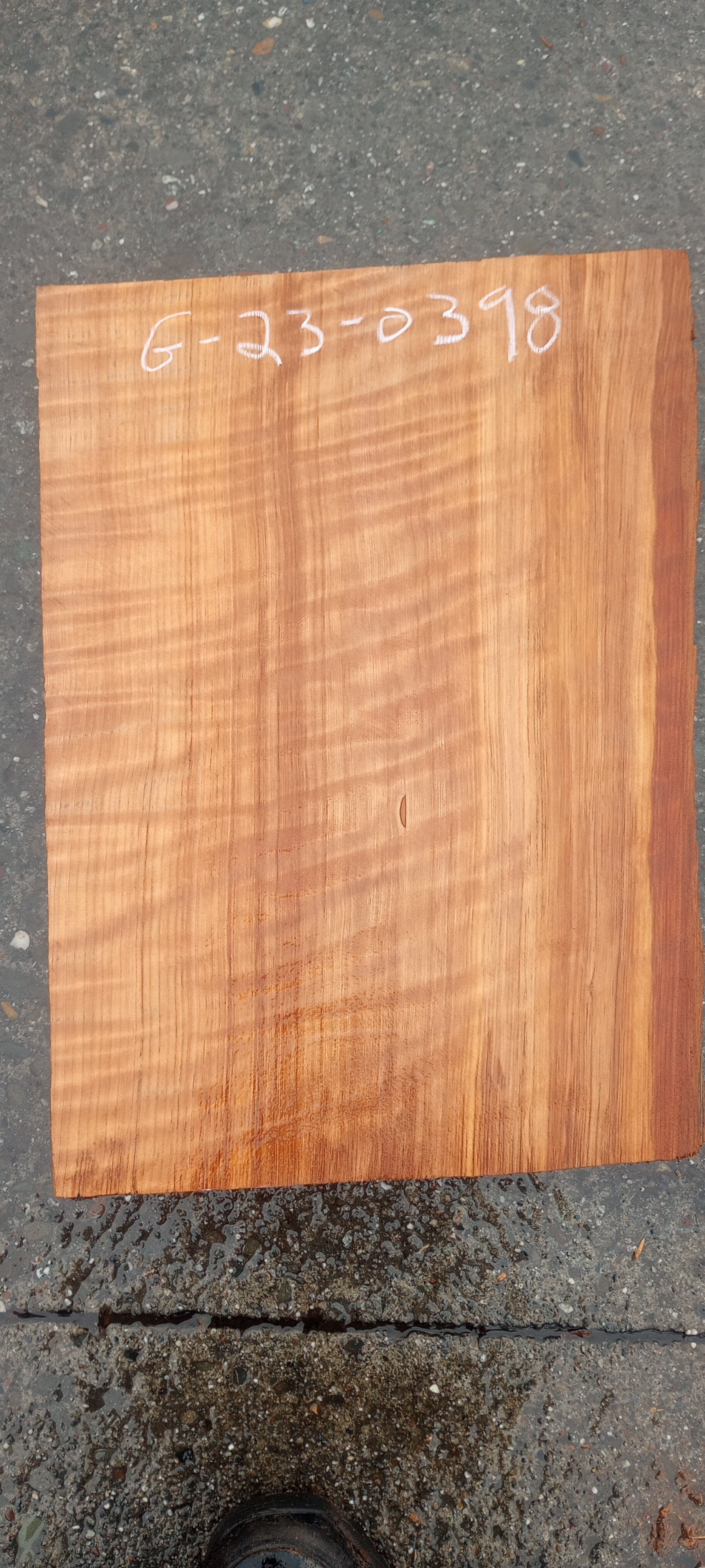 Curly redwood guitar slab G23-0398. Cut to 22x15x2" Let this slab acclimate to your area for about 1+ months. Work it, use it, but do not finish until dry. This sale is for 1 unfinished slab, cleaned up and rough sanded.
