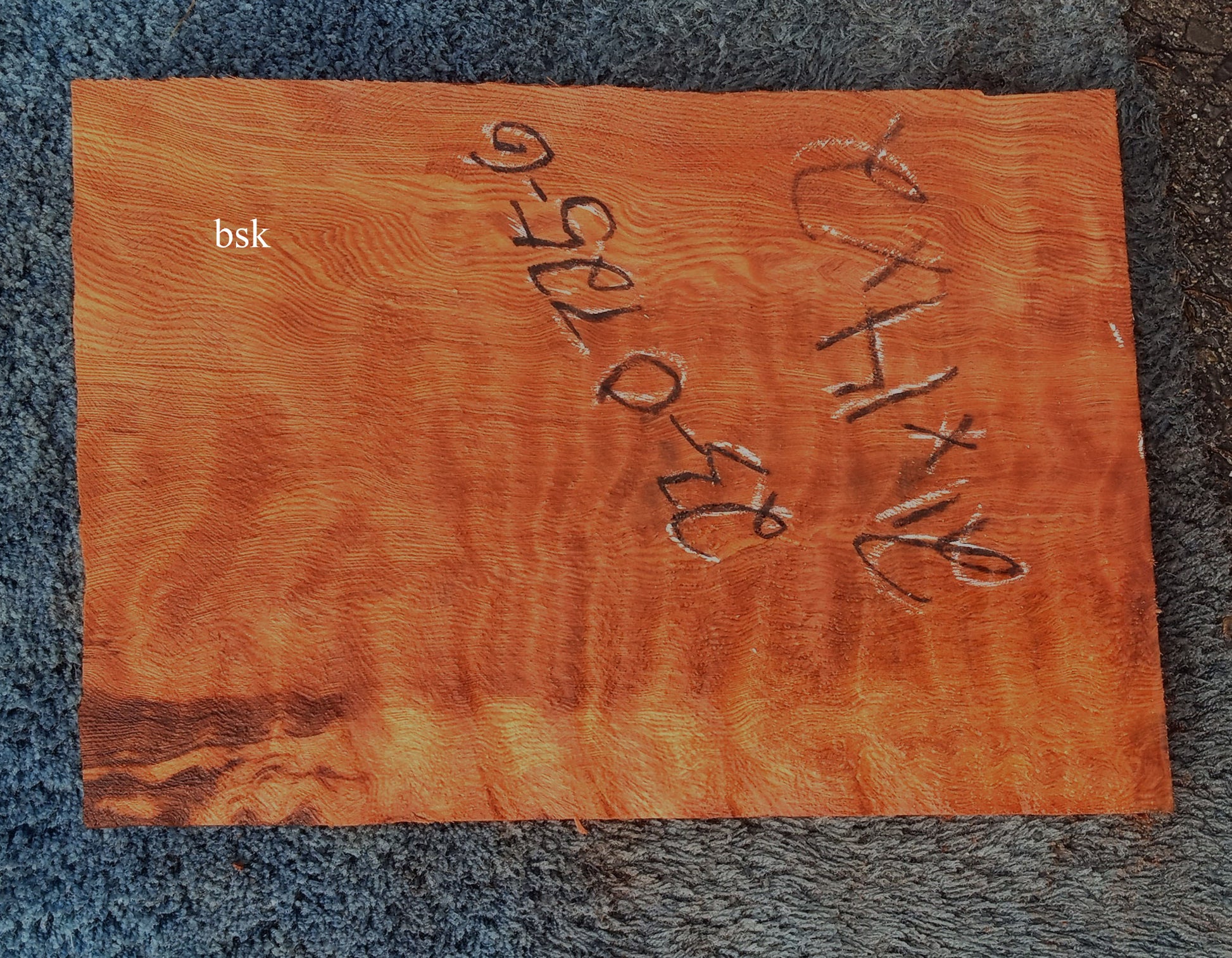 Curly redwood guitar slab G23-0725. Cut to 21x14x2" Let this slab acclimate to your area for about 1+ months. Work it, use it, but do not finish until dry. This sale is for 1 unfinished slab, cleaned up and rough sanded.