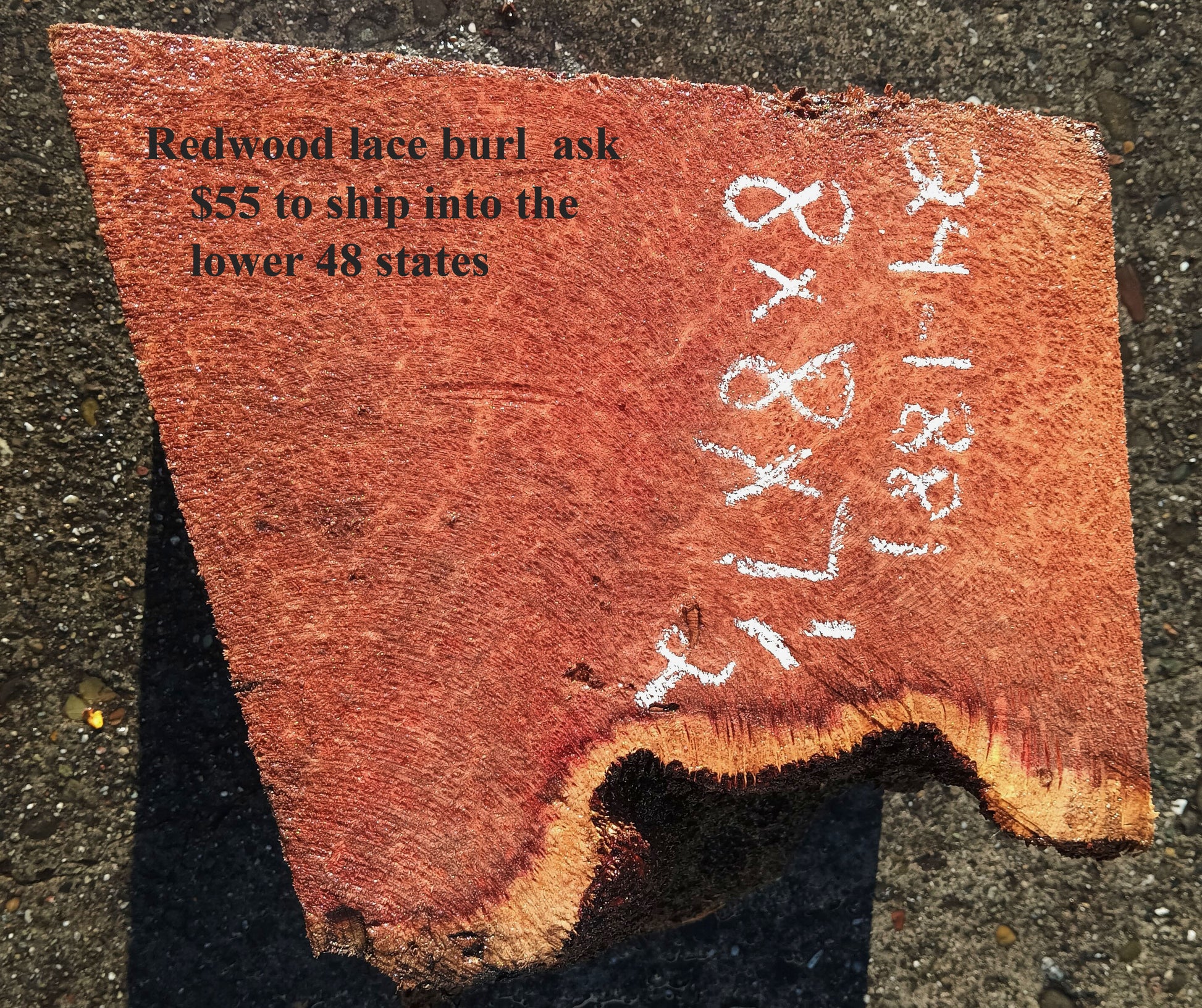 I have over 1000 quilted, curly, burl and figured grain pieces; mostly Redwood, Myrtle, Maple and Poplar. As I am on the coast most pieces are not totally dry. Of course, the best pieces always sell first wet or dry.