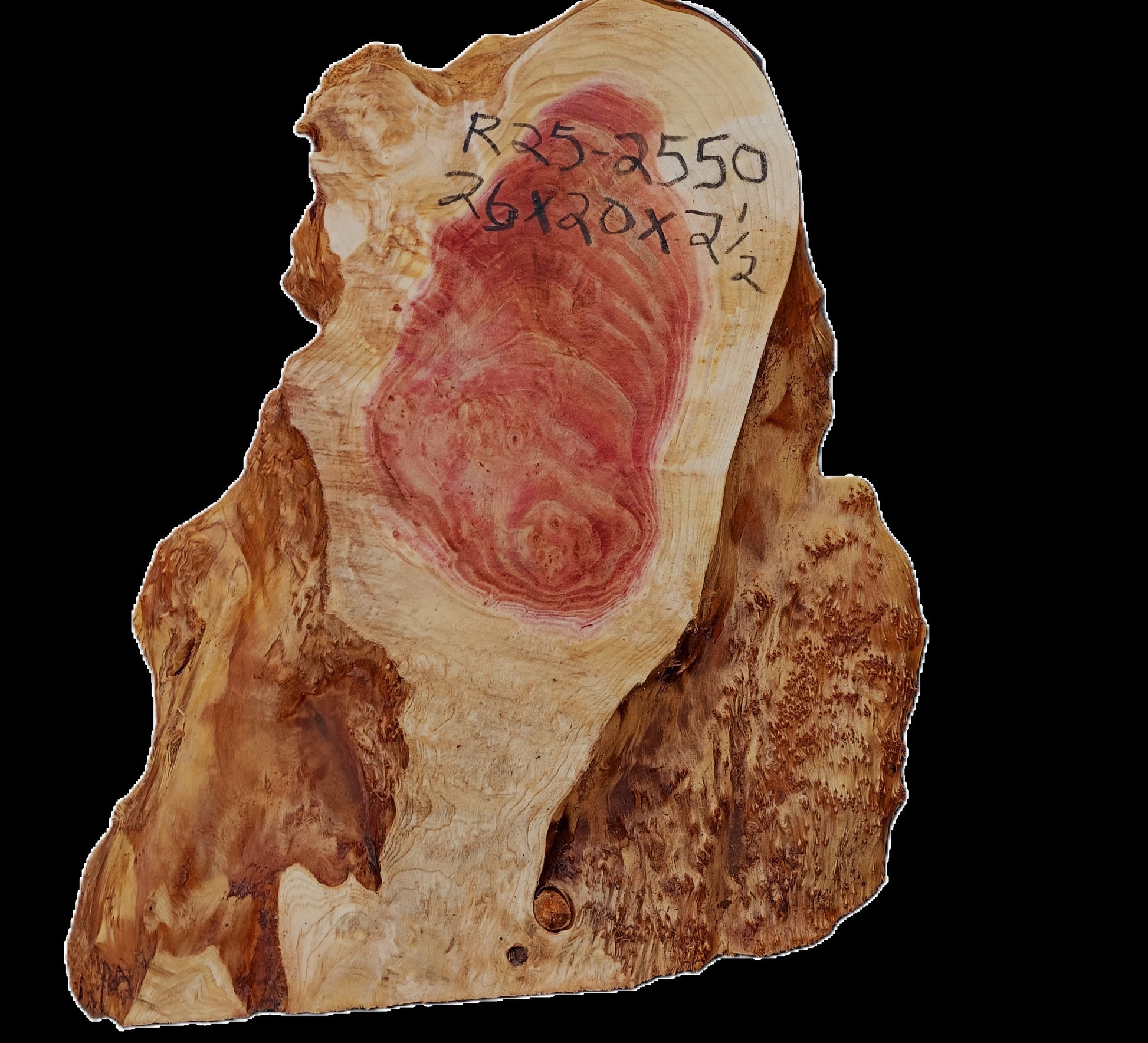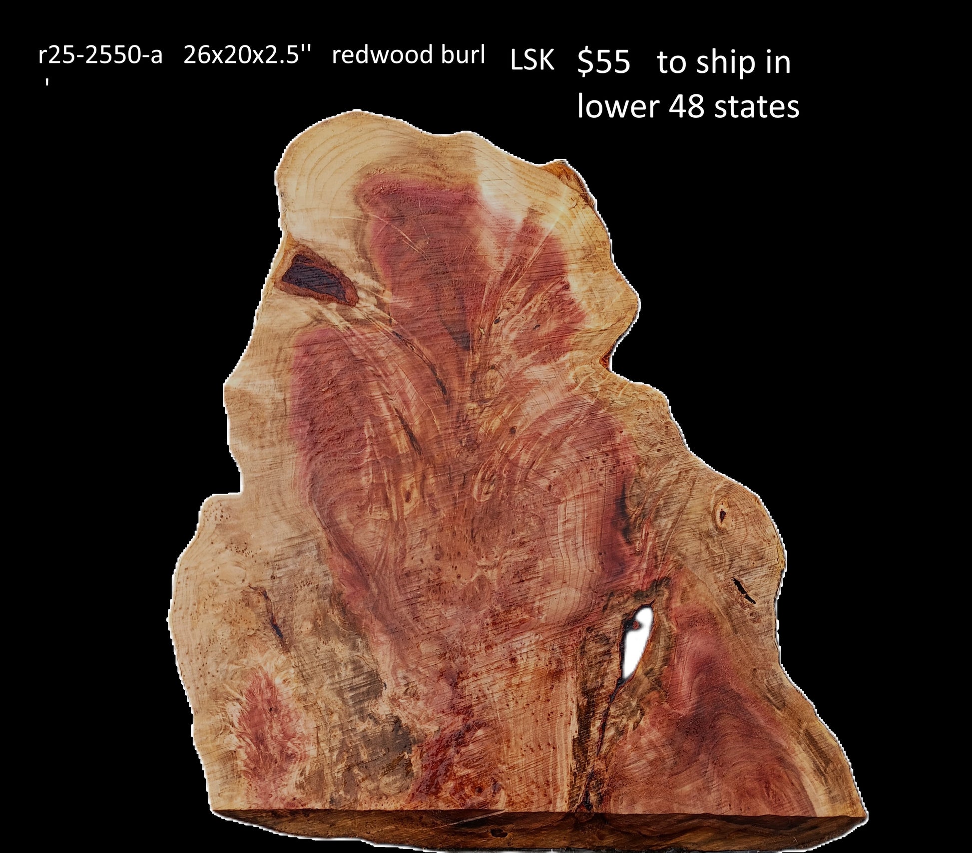 R25-2550 Redwood Lace Burl cut: 26x20x2.5'. Let this slab acclimate to your area for 2 - 3 months. Work it and use it, but do not finish until dry.