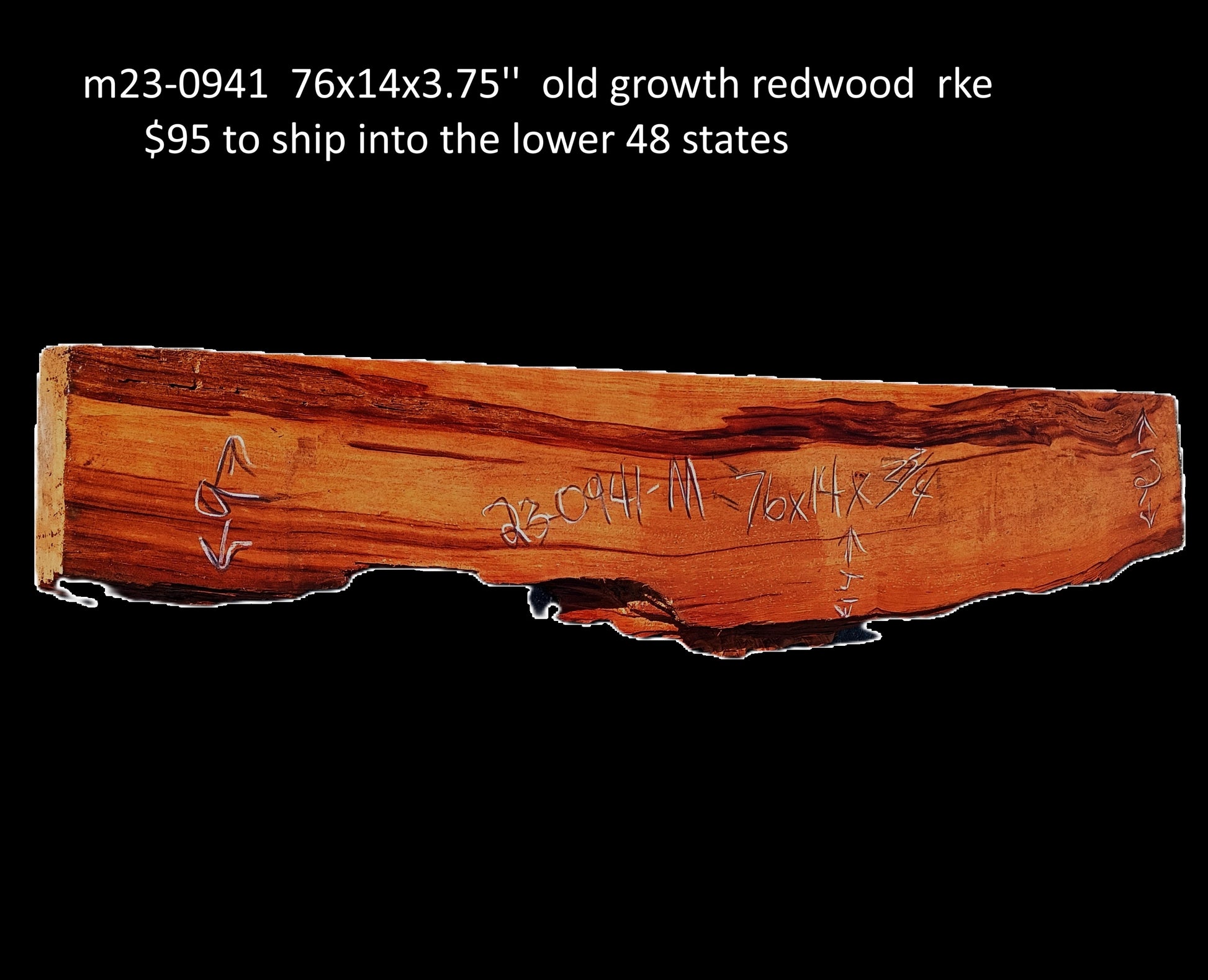 m23-0941 Redwood mantel / Shelf Cut to 76x14x3.75" Let this slab acclimate to your area for about 1 or 2 months. Work it, use it, but do not finish until dry. This sale is for 1 unfinished mantel, which has been cleaned up and rough sanded.