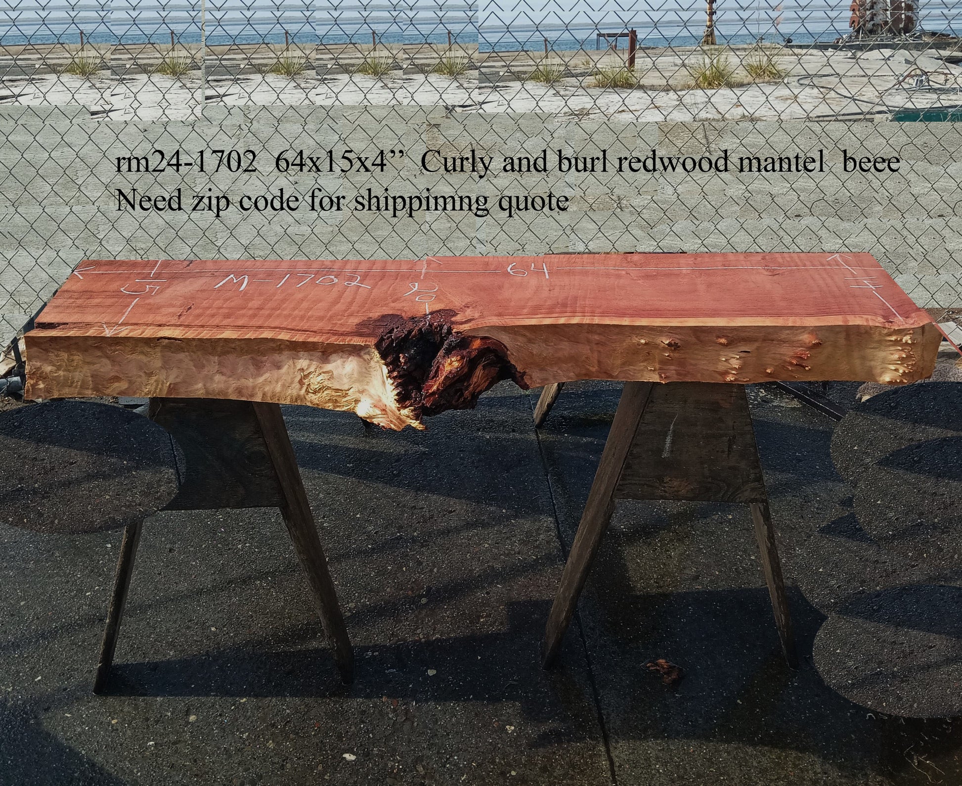 RM24-1702 Curly and Burl Redwood mantel Cut to 64x15x4" Let this slab acclimate to your area for about 2+ months. Work it, use it, but do not finish until dry. This sale is for 1 unfinished mantel, cleaned up and rough sanded.