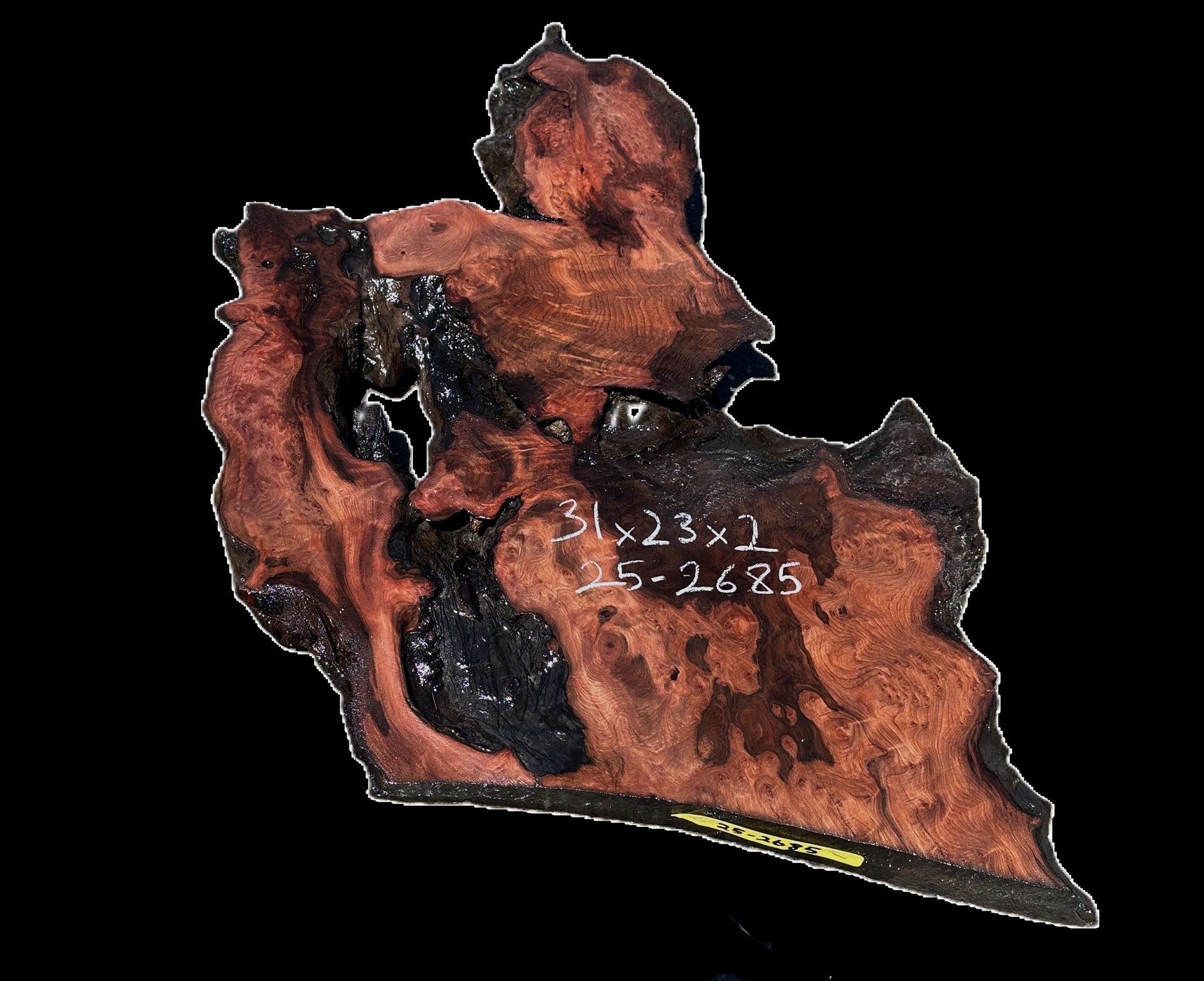 R25-2685 Redwood Slab for River Table or Craft Wood size 31x23x2" cut in Eureka. Dead for 20 years. Let this slab acclimate to your area for about 2 to 3 months. Work it, use it, but do not finish until dry. This sale is for one unfinished piece, rough sanded and cleaned up, but not finished.